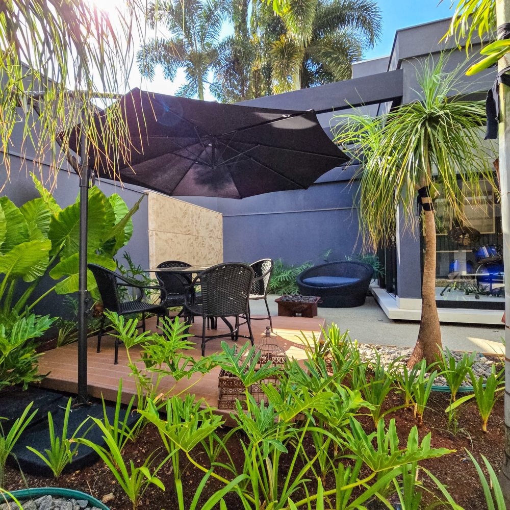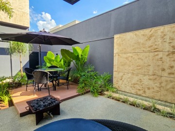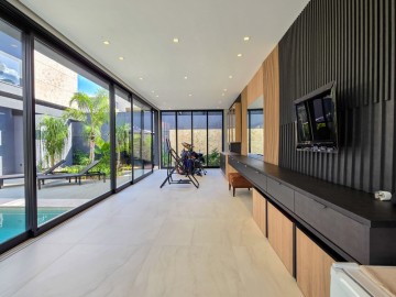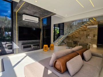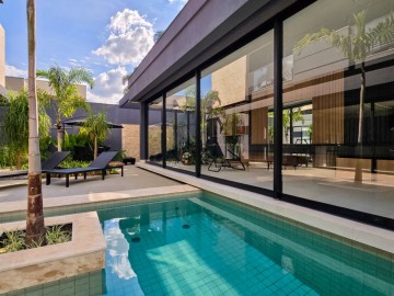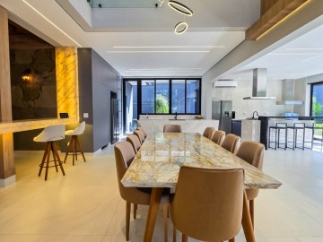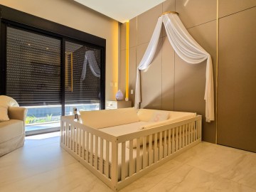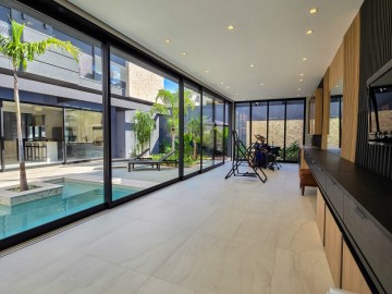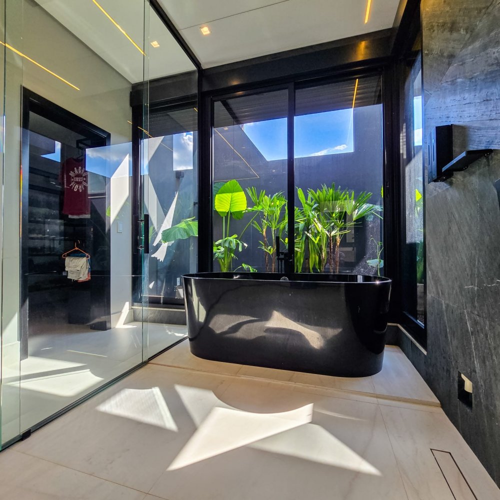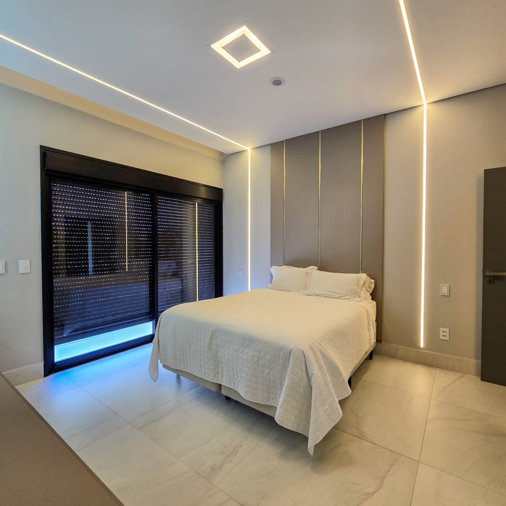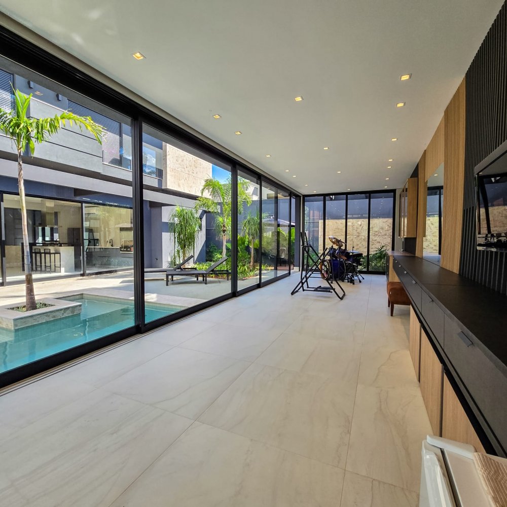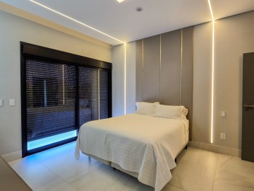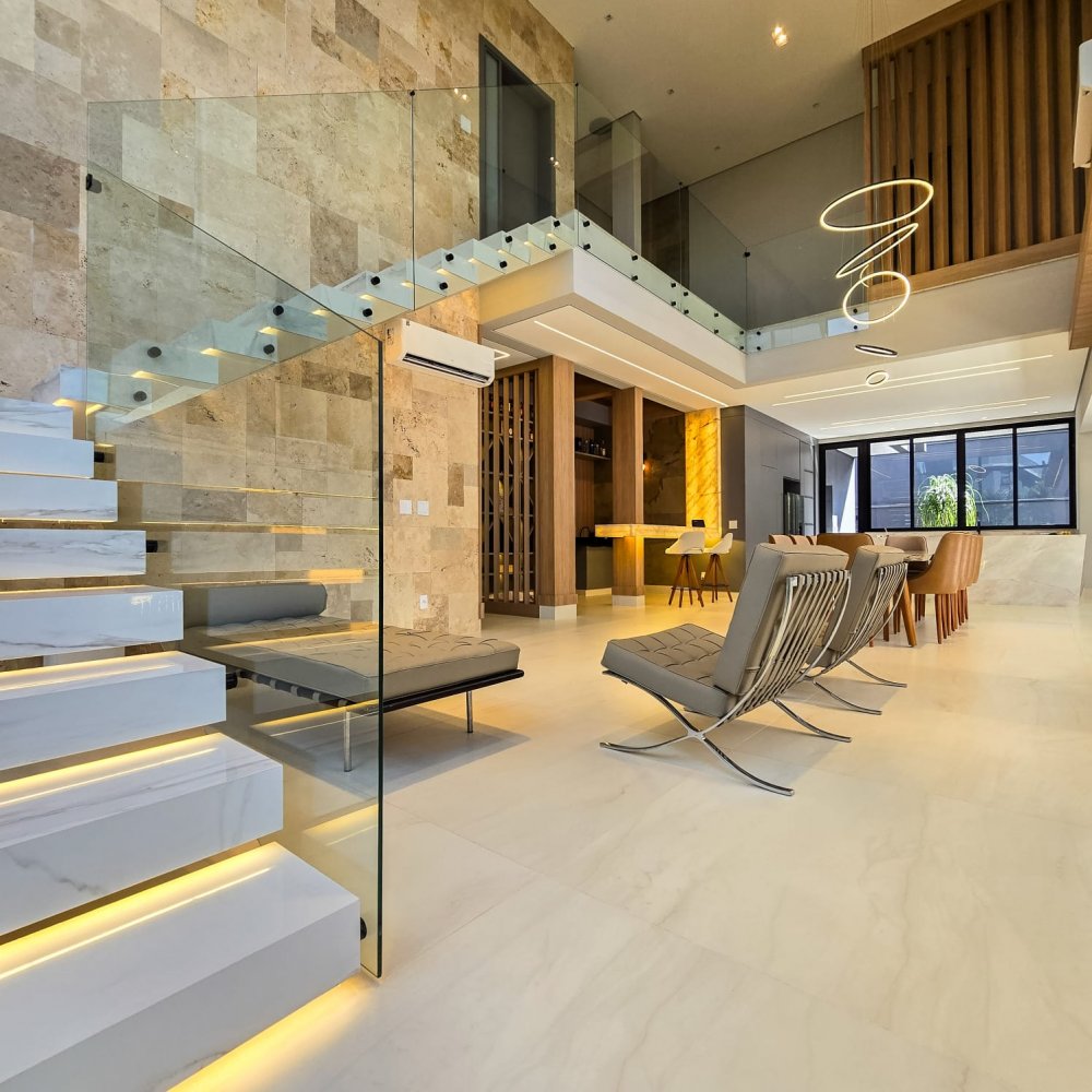 Em um dos maiores lotes do condomínio e uma área construída de aproximadamente 600m². Dispõe de 4 suítes, escritório reversível para 5ª suíte, lavabo, armários planejados, ampla sala com 7 ambientes, sala íntima no piso superior, copa de apoio, cozinha gourmet integrada, e ainda conta com um espaço multiuso, piscina ampla e sauna, 8 vagas de garagem e acesso ao lazer do condomínio.