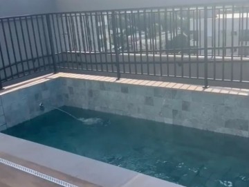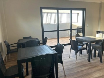 Condomínio com portaria e lazer: piscina na cobertura e salão de festas com churrasqueira.