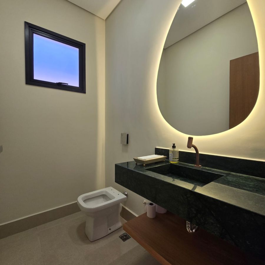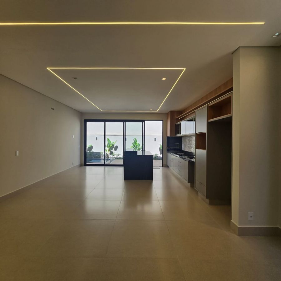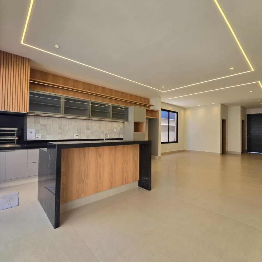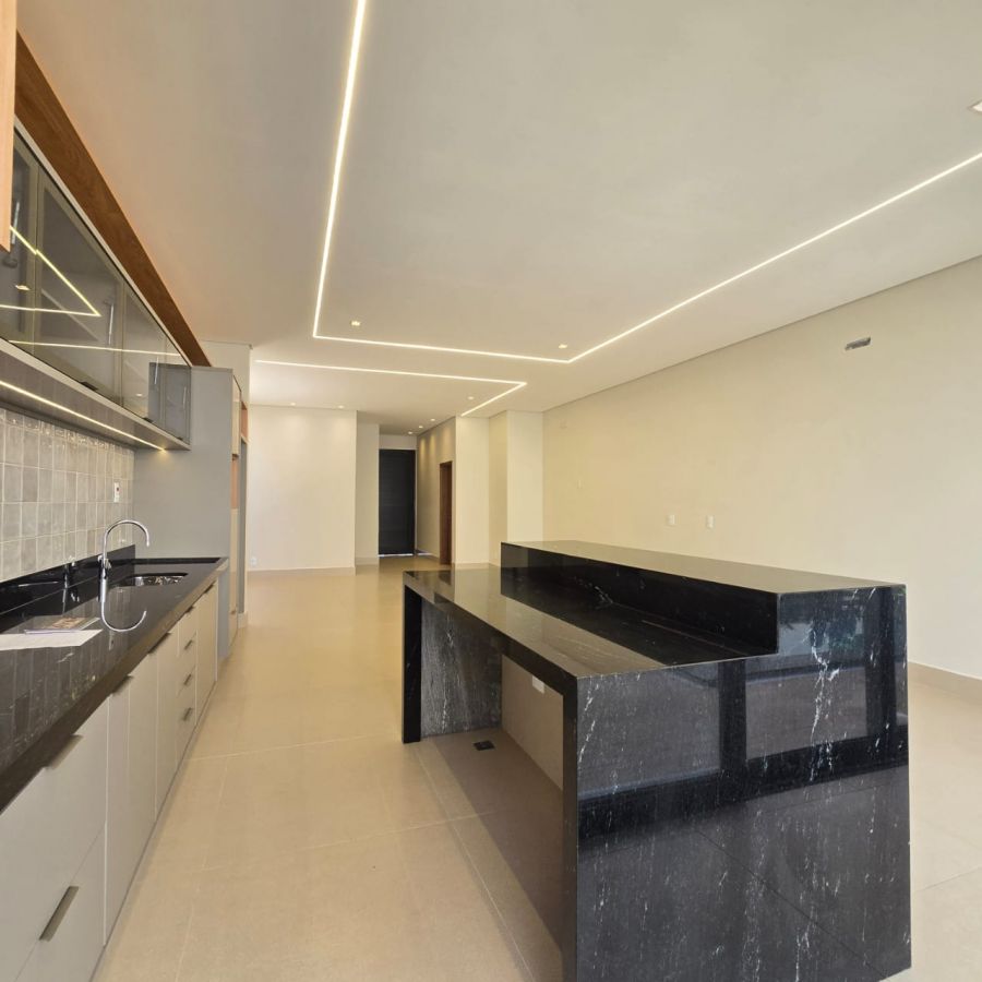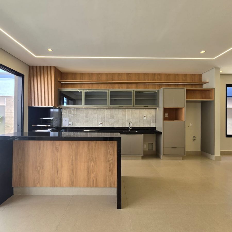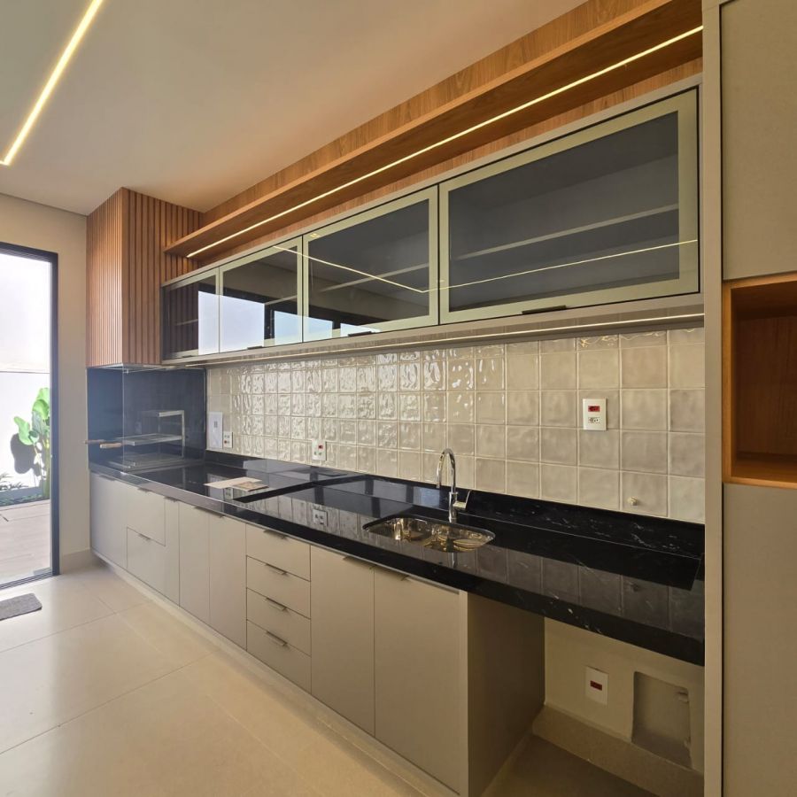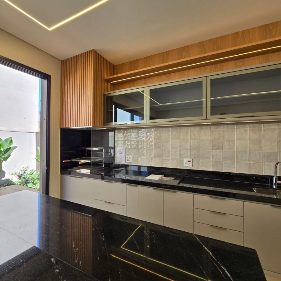 Porta de entrada com fechadura eletrônica. Sala 2 ambientes, com iluminação natural e com perfis de led, integrado com a cozinha gourmet. Lavabo com mármore verde guatemala, torneira cor rosé gold matte. Escritório. 3 suítes com armários, com persianas automatizadas, sendo a master com closet e banheiro com 2 cubas. Cozinha gourmet com bancada granito via láctea, rica marcenaria com amortecimento, churrasqueira a carvão revestida em marcenaria ripada, espaço projetado para cooktop, lava louças 14 serviços, torre quente e geladeira 2 portas. Piscina com pré aquecimento e iluminação. Vestiário Externo. Paisagismo adulto com iluminação.