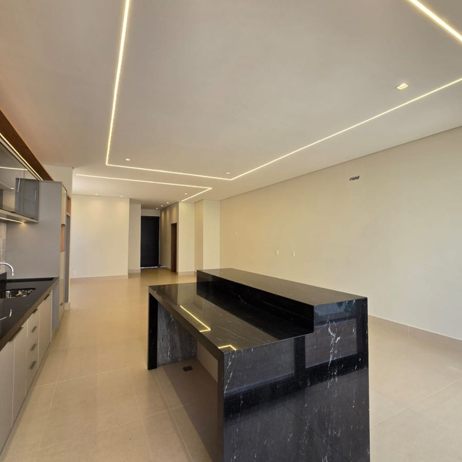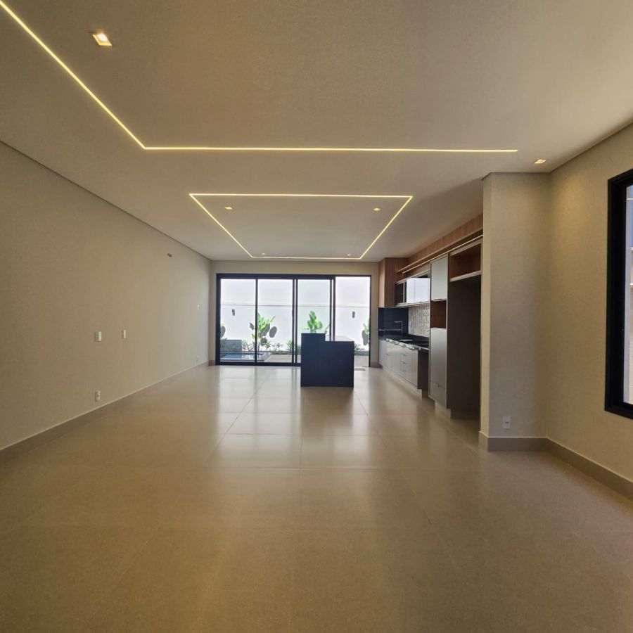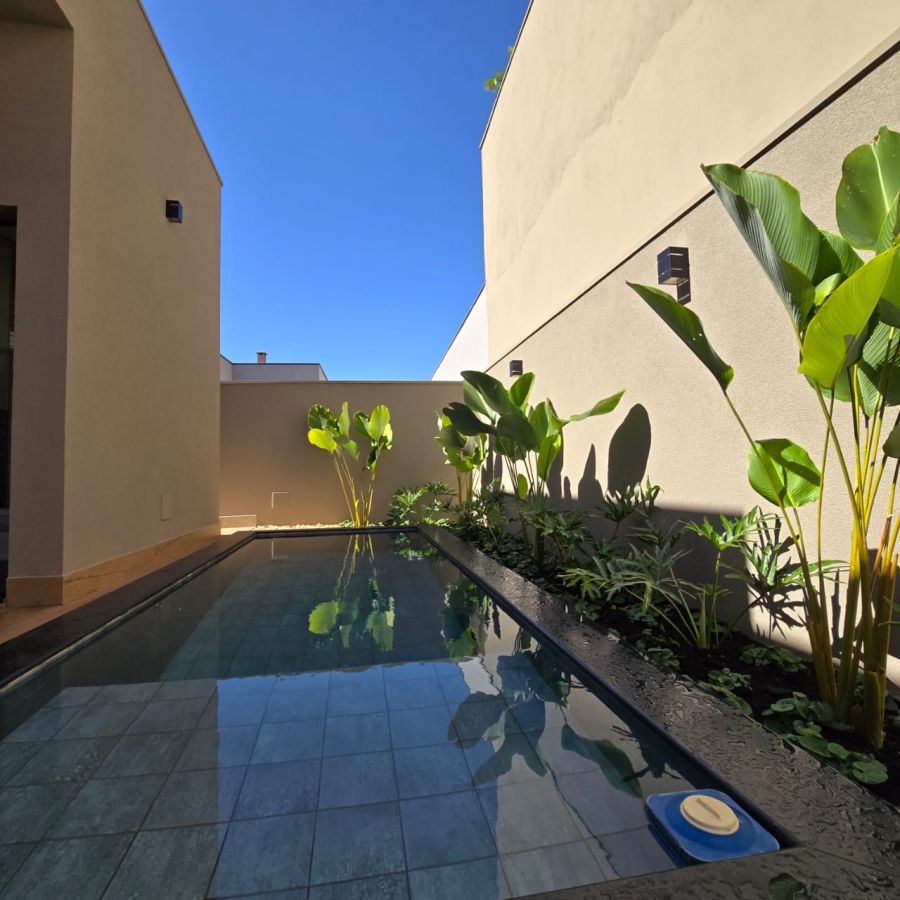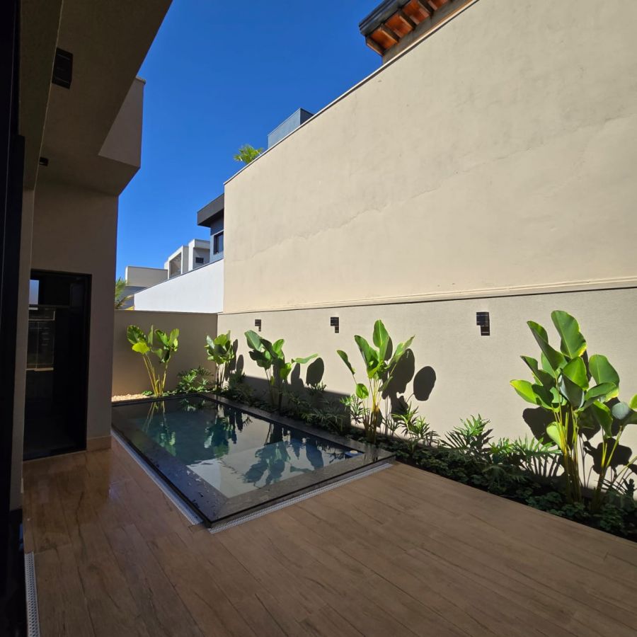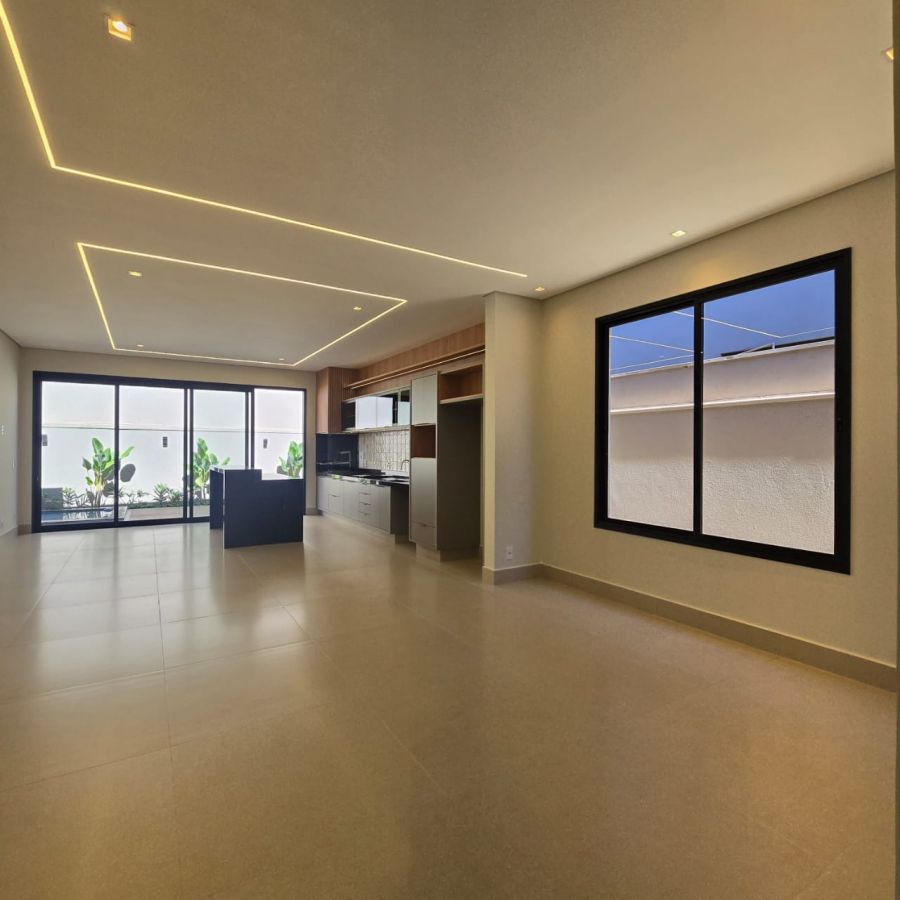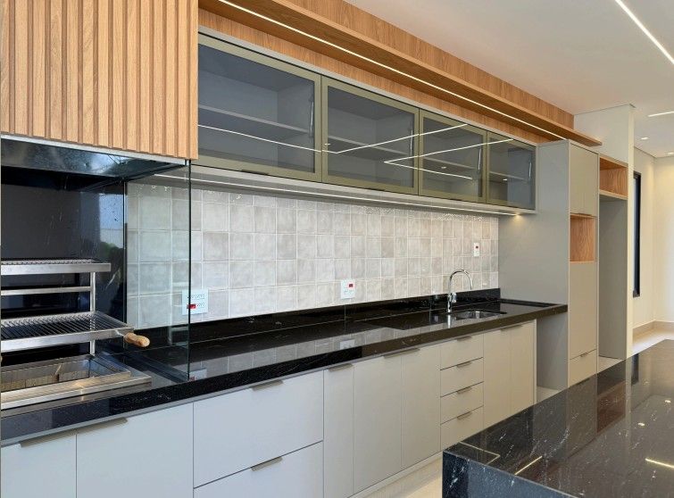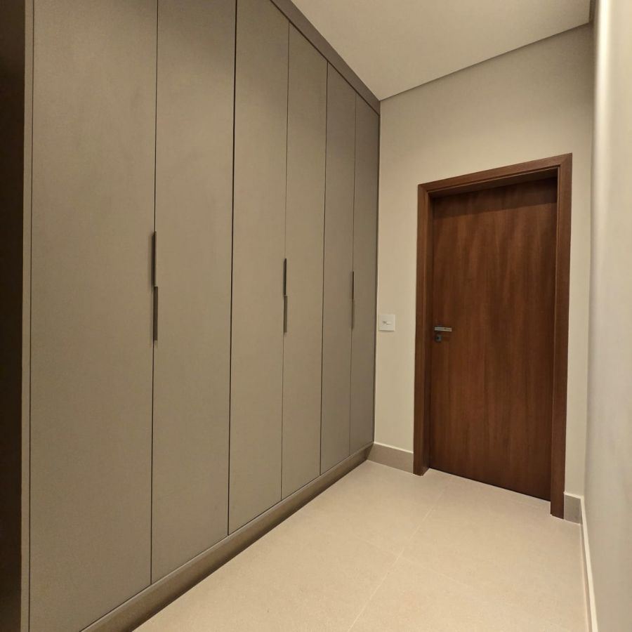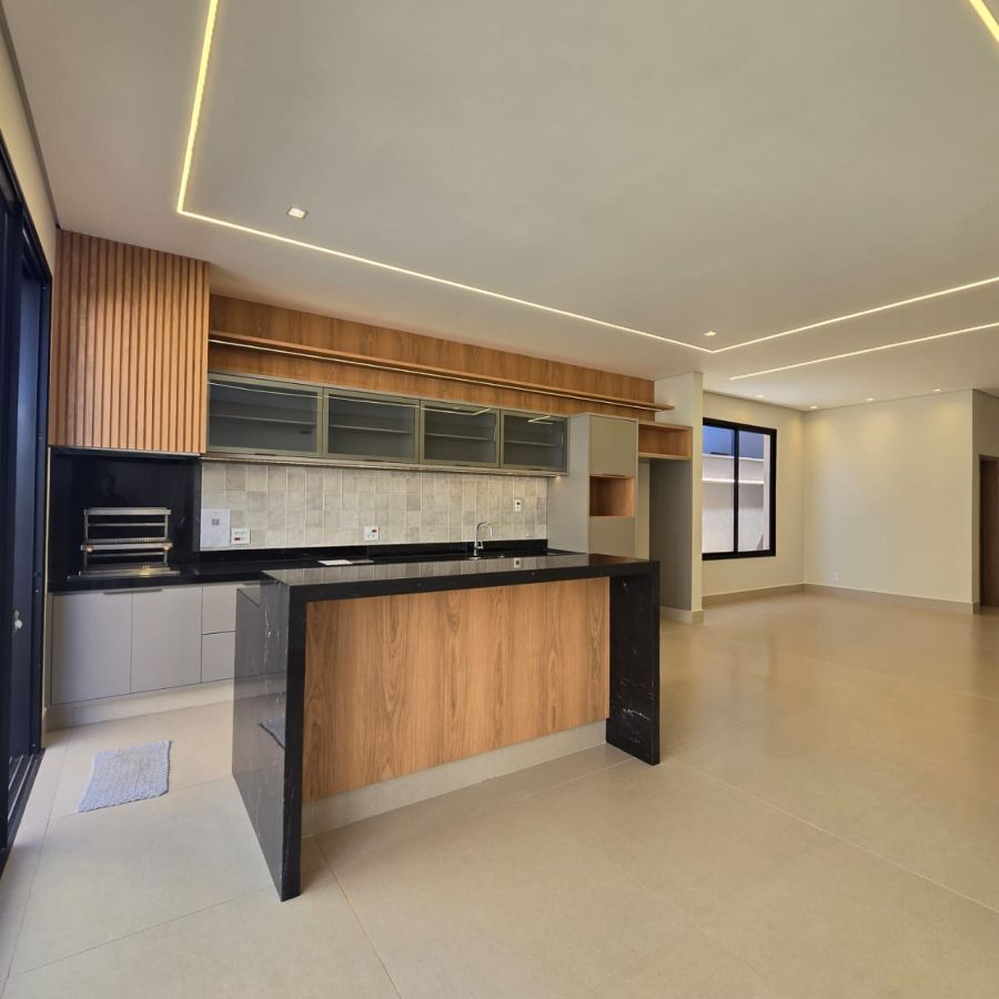 Porta de entrada com fechadura eletrônica. Sala 2 ambientes, com iluminação natural e com perfis de led, integrado com a cozinha gourmet. Lavabo com mármore verde guatemala, torneira cor rosé gold matte. Escritório. 3 suítes com armários, com persianas automatizadas, sendo a master com closet e banheiro com 2 cubas. Cozinha gourmet com bancada granito via láctea, rica marcenaria com amortecimento, churrasqueira a carvão revestida em marcenaria ripada, espaço projetado para cooktop, lava louças 14 serviços, torre quente e geladeira 2 portas. Piscina com pré aquecimento e iluminação. Vestiário Externo. Paisagismo adulto com iluminação.