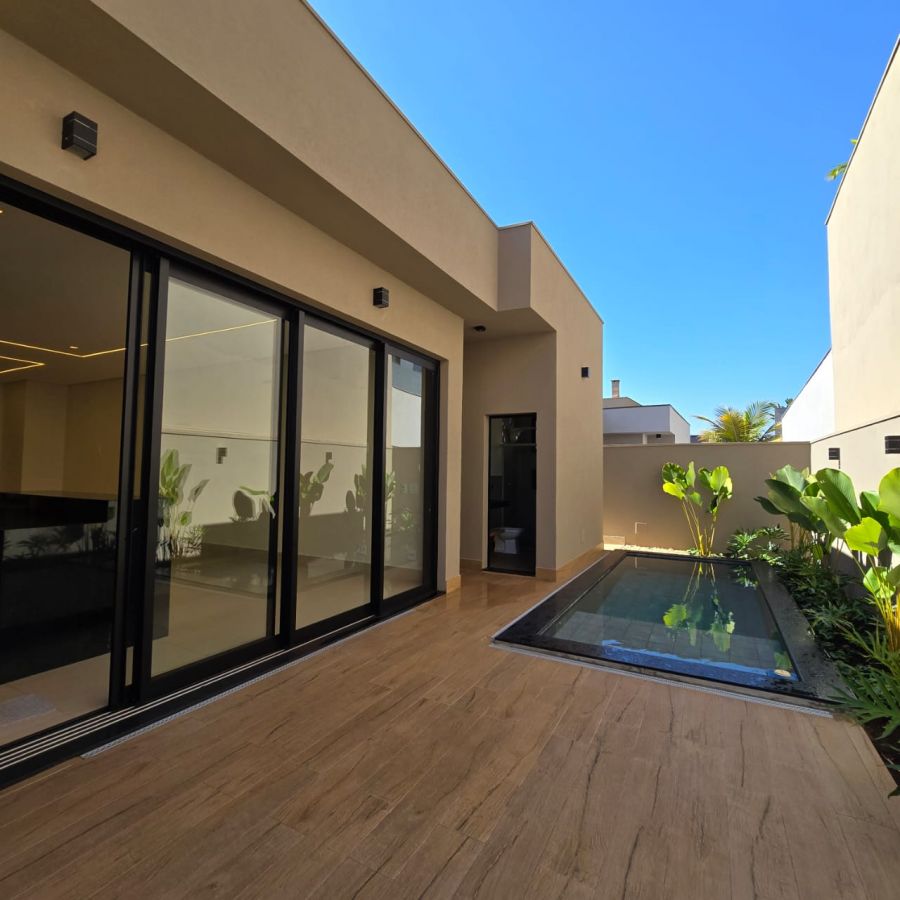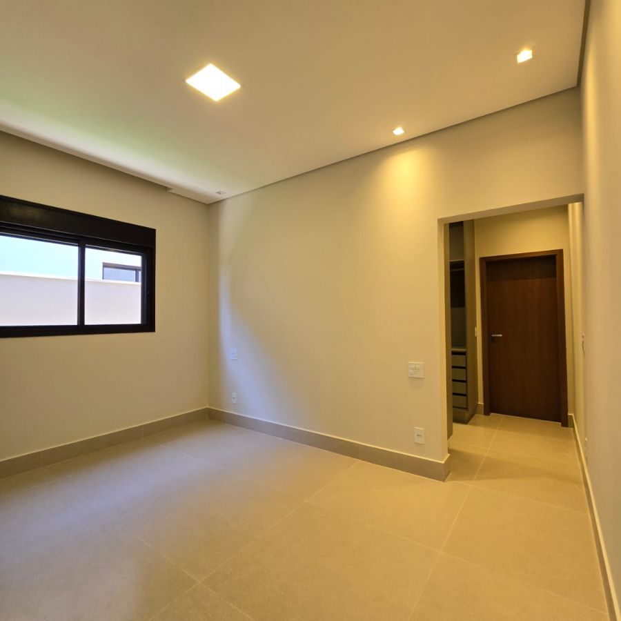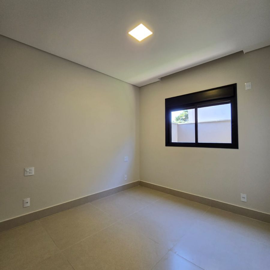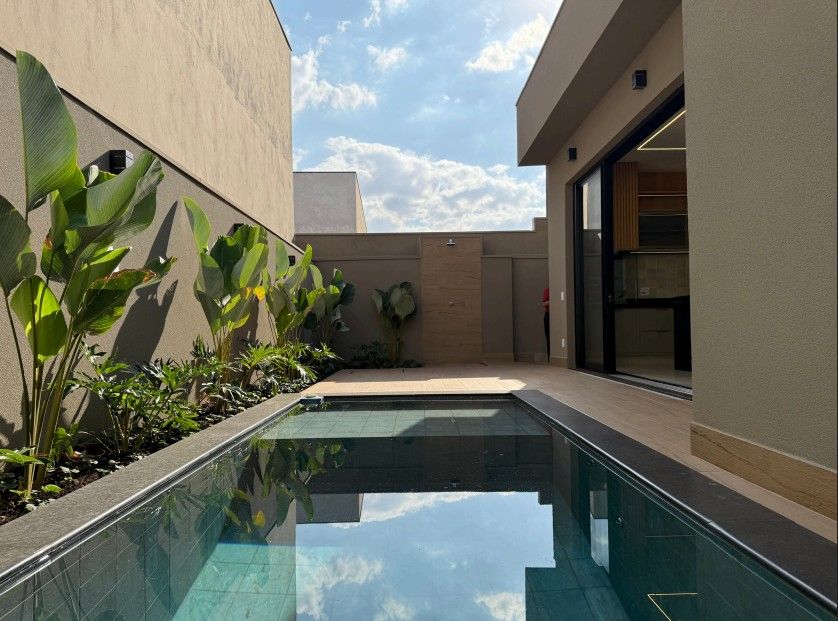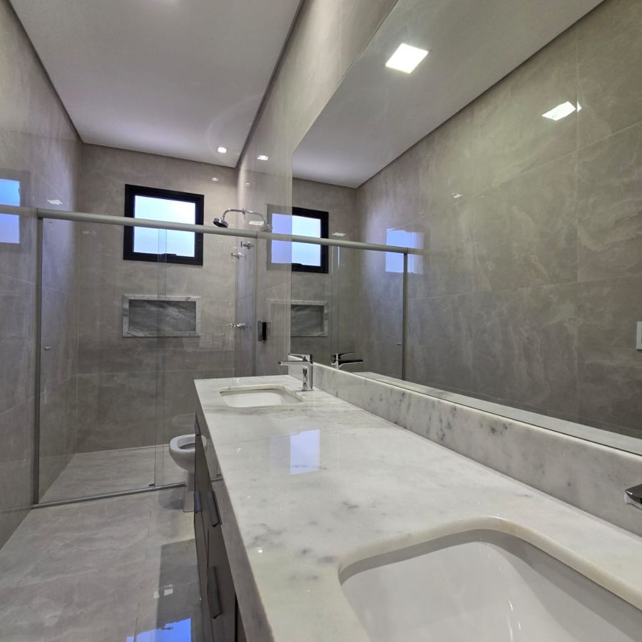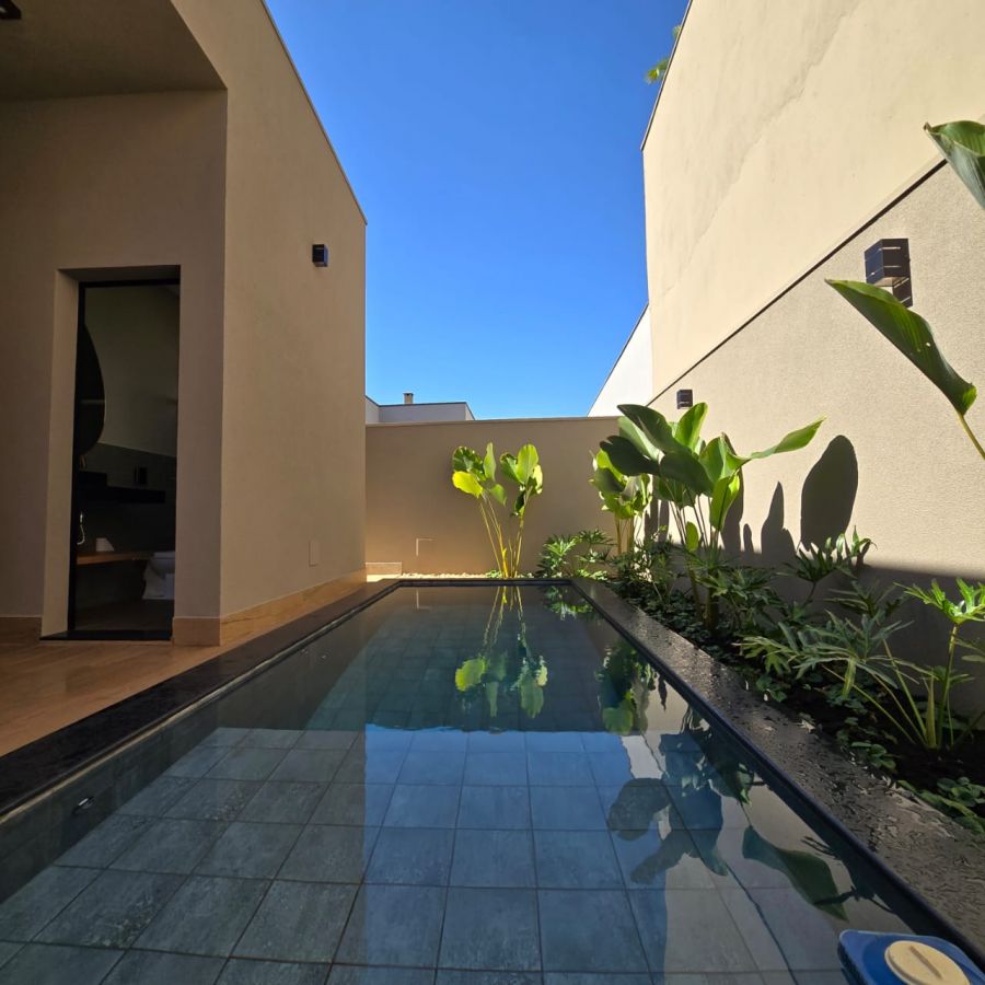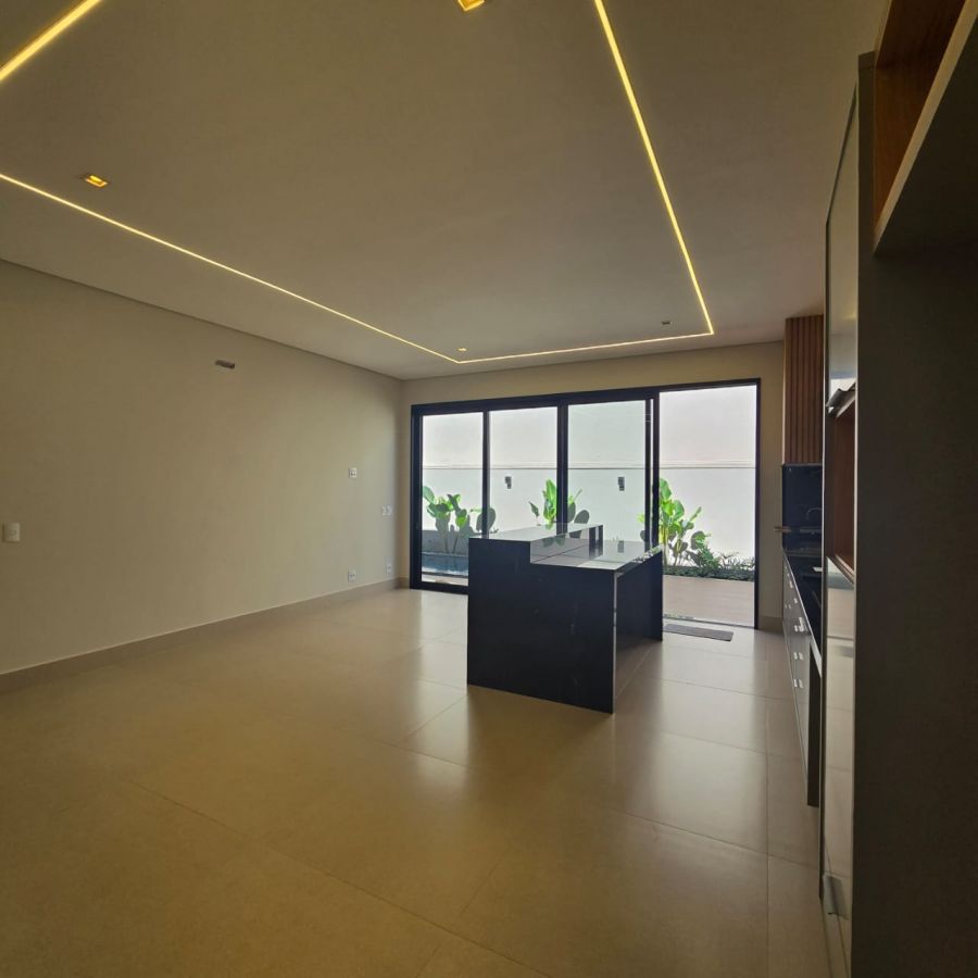Porta de entrada com fechadura eletrônica. Sala 2 ambientes, com iluminação natural e com perfis de led, integrado com a cozinha gourmet. Lavabo com mármore verde guatemala, torneira cor rosé gold matte. Escritório. 3 suítes com armários, com persianas automatizadas, sendo a master com closet e banheiro com 2 cubas. Cozinha gourmet com bancada granito via láctea, rica marcenaria com amortecimento, churrasqueira a carvão revestida em marcenaria ripada, espaço projetado para cooktop, lava louças 14 serviços, torre quente e geladeira 2 portas. Piscina com pré aquecimento e iluminação. Vestiário Externo. Paisagismo adulto com iluminação.