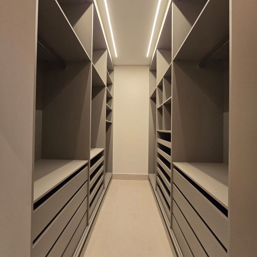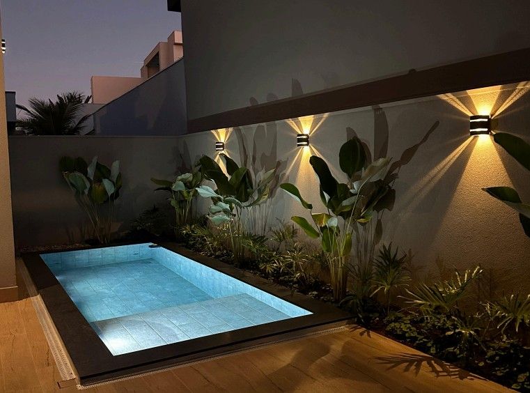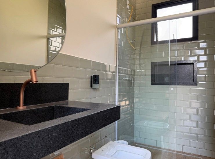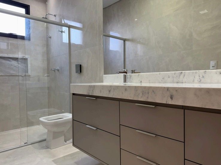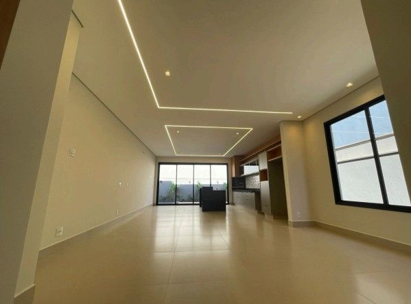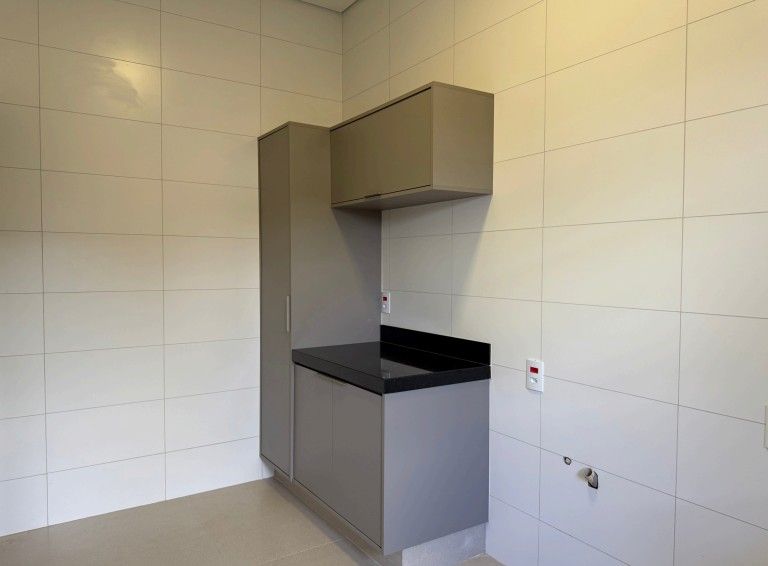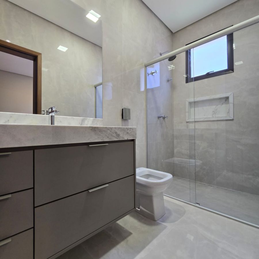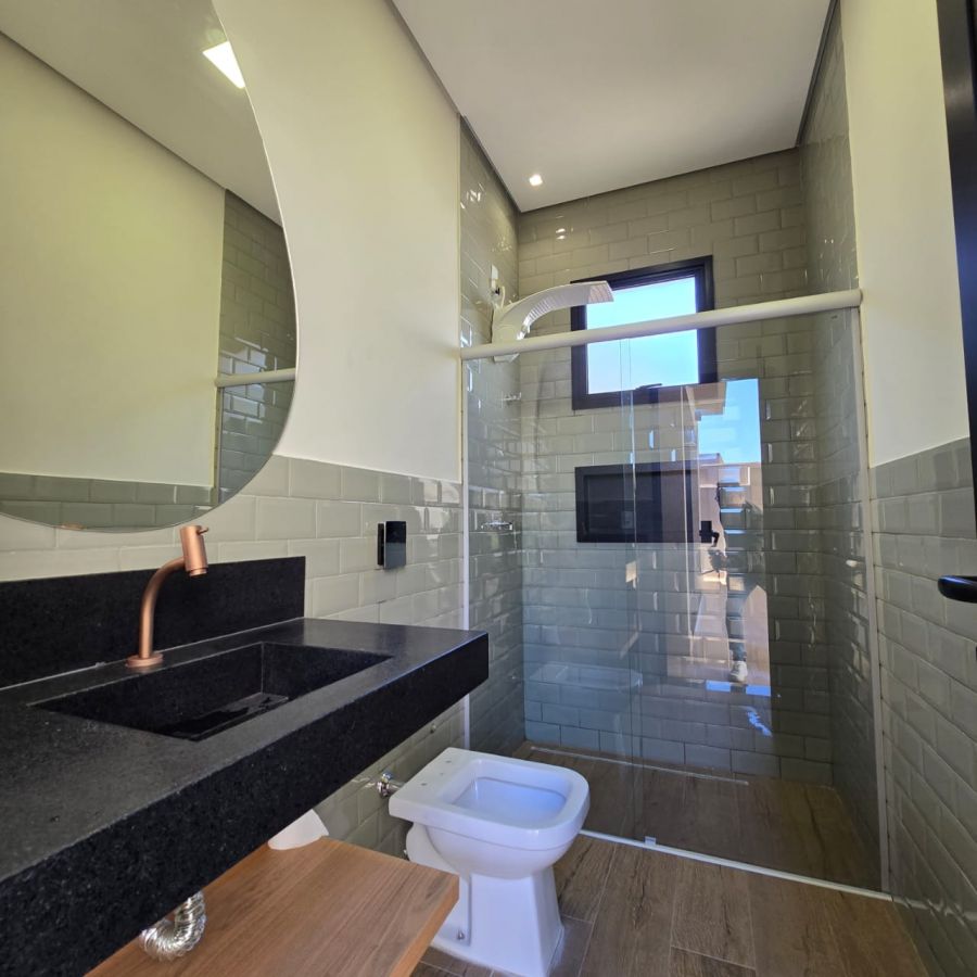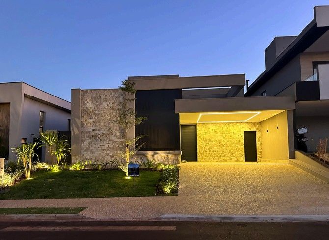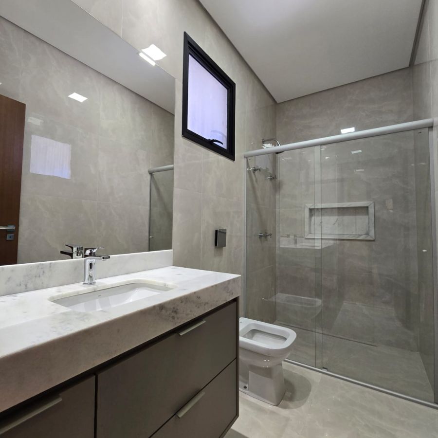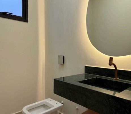Porta de entrada com fechadura eletrônica. Sala 2 ambientes, com iluminação natural e com perfis de led, integrado com a cozinha gourmet. Lavabo com mármore verde guatemala, torneira cor rosé gold matte. Escritório. 3 suítes com armários, com persianas automatizadas, sendo a master com closet e banheiro com 2 cubas. Cozinha gourmet com bancada granito via láctea, rica marcenaria com amortecimento, churrasqueira a carvão revestida em marcenaria ripada, espaço projetado para cooktop, lava louças 14 serviços, torre quente e geladeira 2 portas. Piscina com pré aquecimento e iluminação. Vestiário Externo. Paisagismo adulto com iluminação.