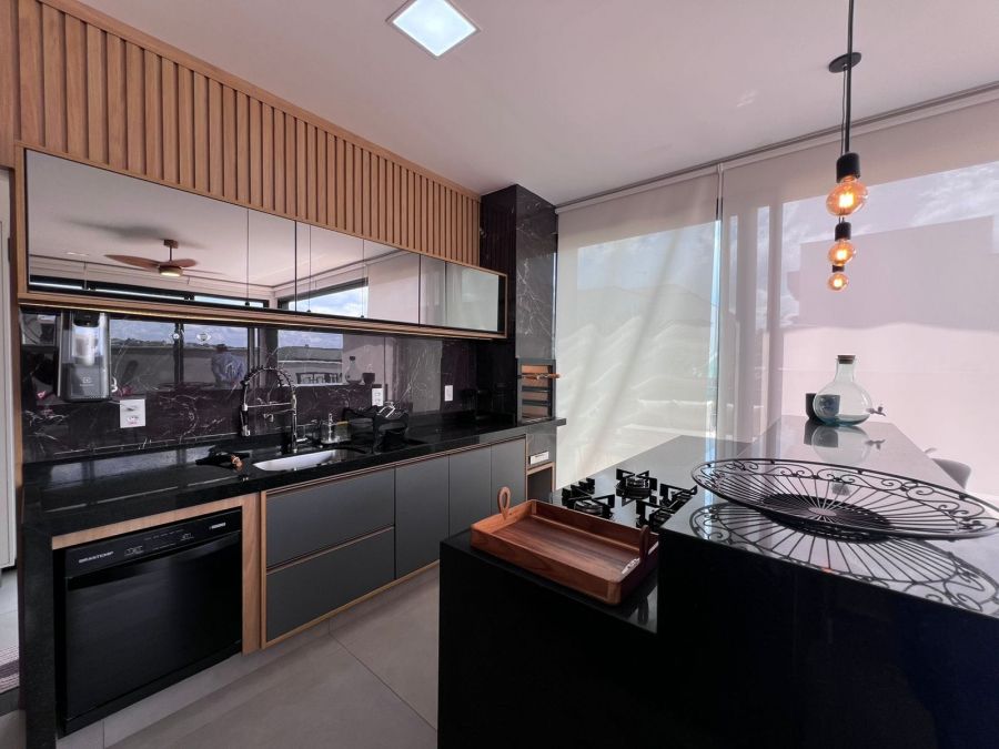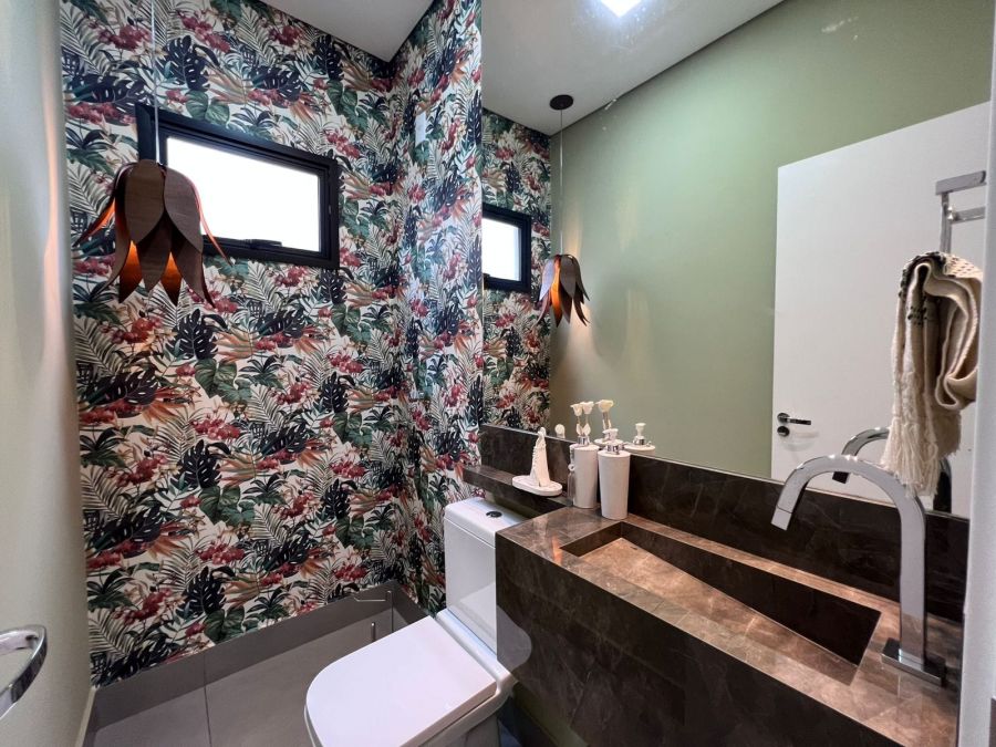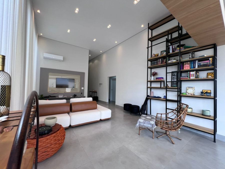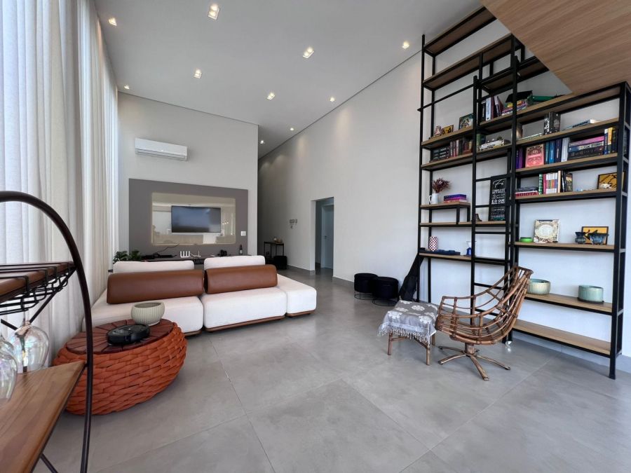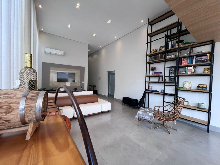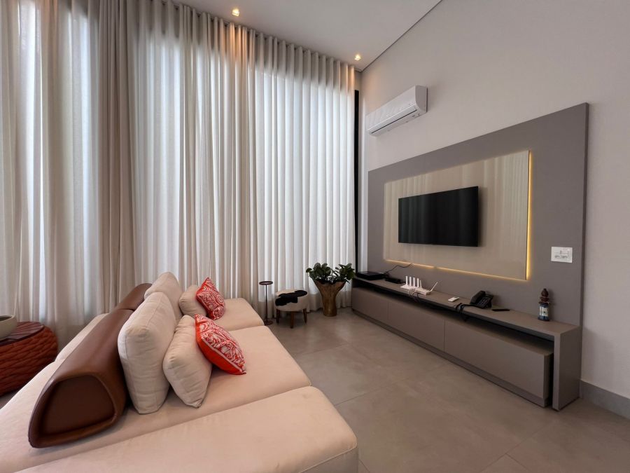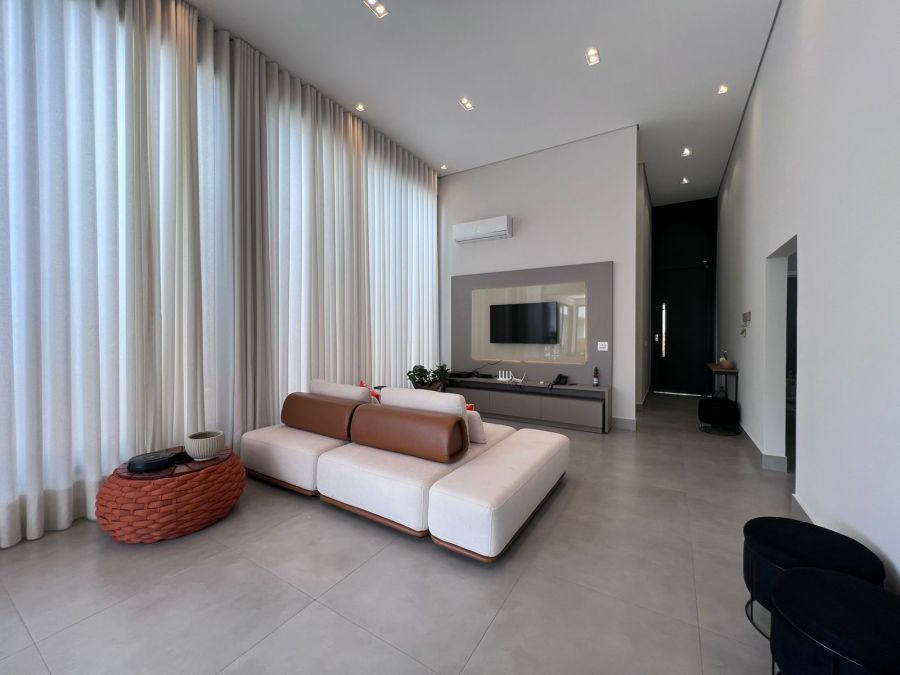 Fachada imponente e moderna. Garagem para 4 carros, sendo 2 cobertas. Hall de entrada. Lavabo. Amplo escritório. Sala 2 ambientes com painel, ar condicionado e pé direito alto, integrada a Cozinha gourmet com churrasqueira a carvão e ilha. 3 suítes, sendo a master com closet. Piscina e amplo espaço aberto. Casa entregue com iluminação, cortinas, paisagismo, armários e ar condicionado.