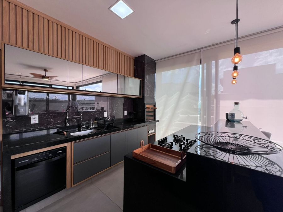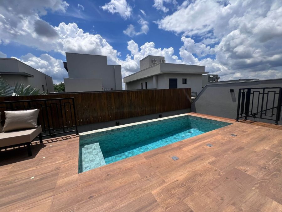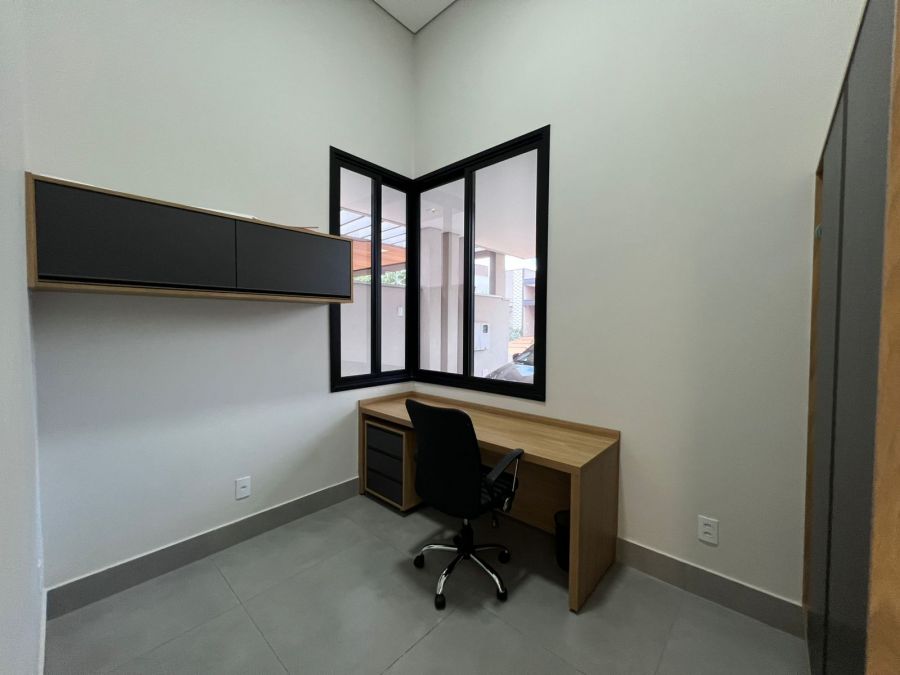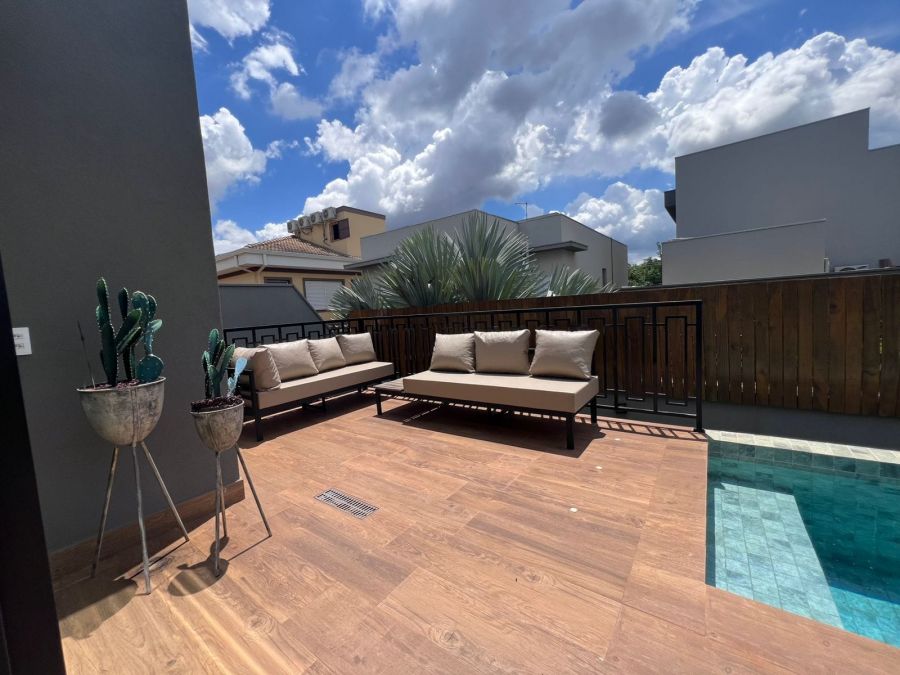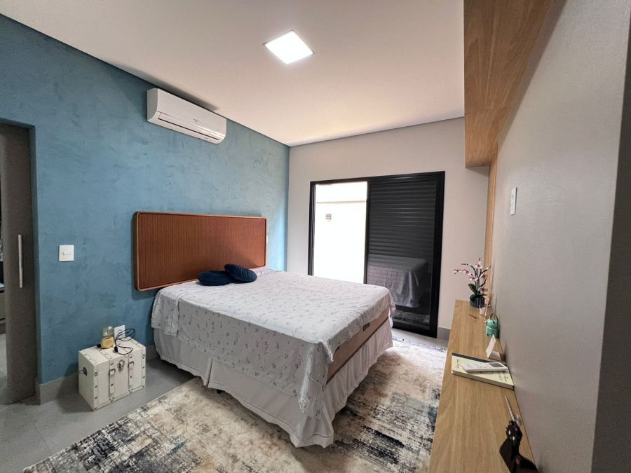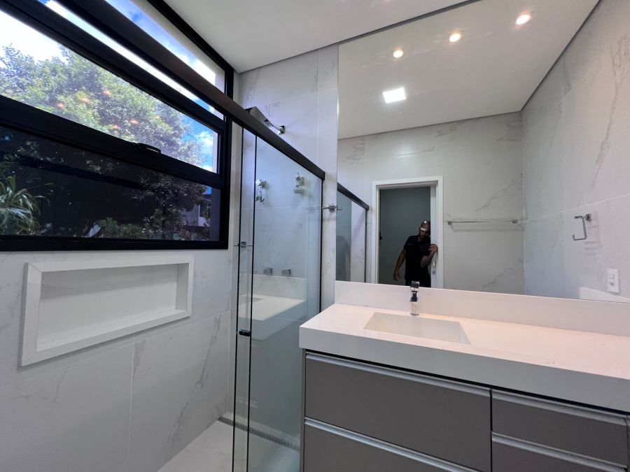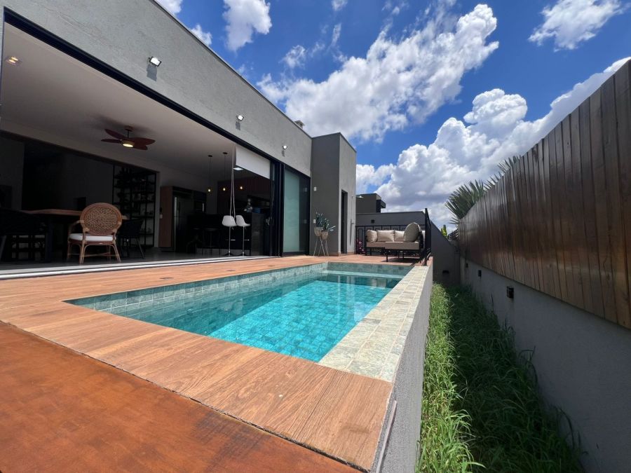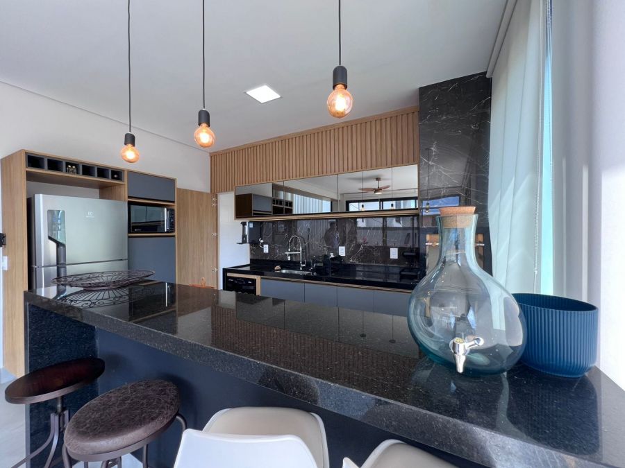 Fachada imponente e moderna. Garagem para 4 carros, sendo 2 cobertas. Hall de entrada. Lavabo. Amplo escritório. Sala 2 ambientes com painel, ar condicionado e pé direito alto, integrada a Cozinha gourmet com churrasqueira a carvão e ilha. 3 suítes, sendo a master com closet. Piscina e amplo espaço aberto. Casa entregue com iluminação, cortinas, paisagismo, armários e ar condicionado.