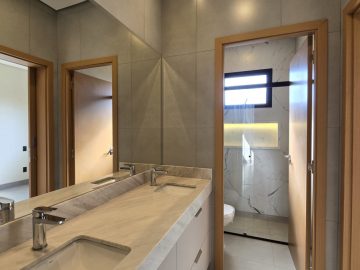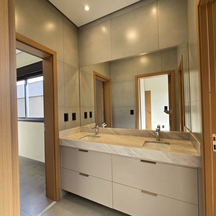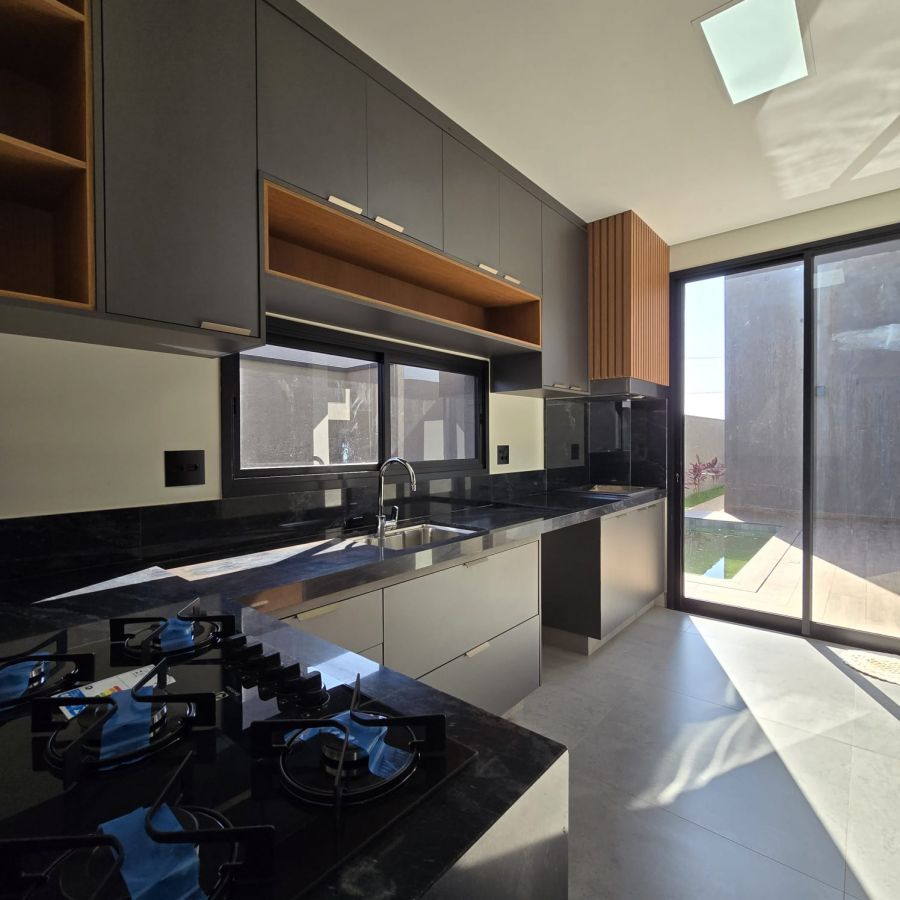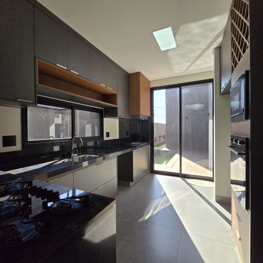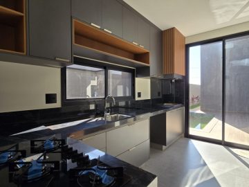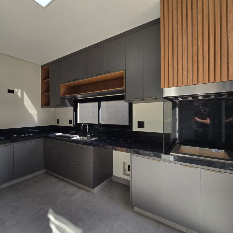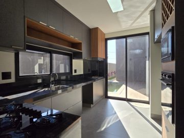 Sala 2 ambientes com pé direito alto, porta de entrada com fechadura eletrônica.Lavabo com espelhos e marcenaria. Cozinha gourmet com ilha, churrasqueira, completa em armários, cooktop e forno . Área de serviço com armários. 3 suítes, sendo 2 no estilo americano e a master com closet e banheiro com cuba dupla e chuveiro duplo. Piscina com cascata, iluminação e parte hidráulica preparada para aquecimento.
