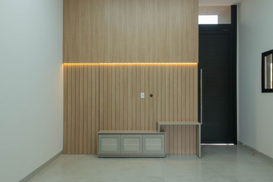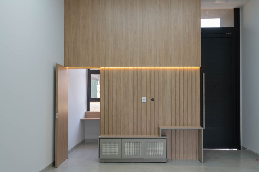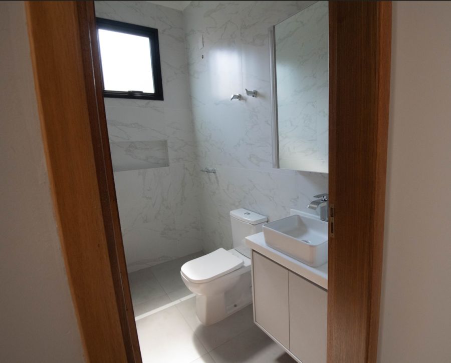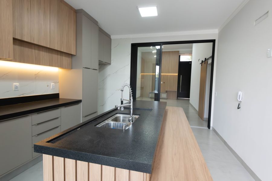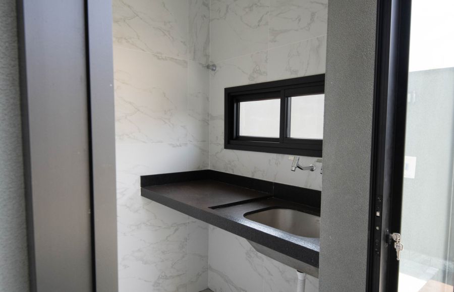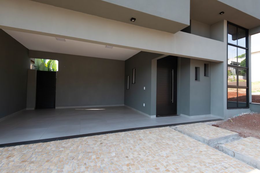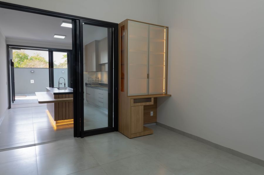 Sala com pé direito alto, 3 suítes com armários, lavabo, escritório, cozinha gourmet com churrasqueira e ilha, área de serviço, depósito, piscina e vestiário, garagem para 4 carros, água quente e fria nos banheiros e cozinha, entregue com iluminação e armários.