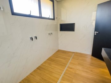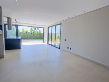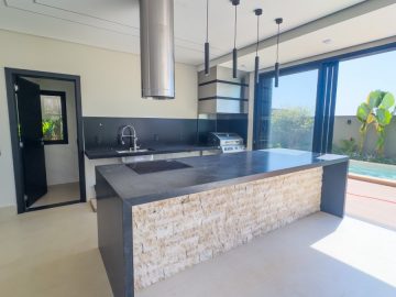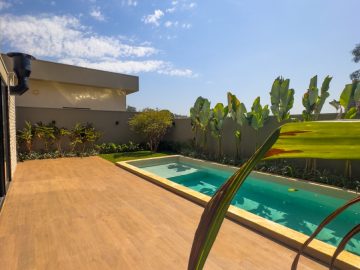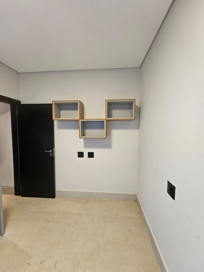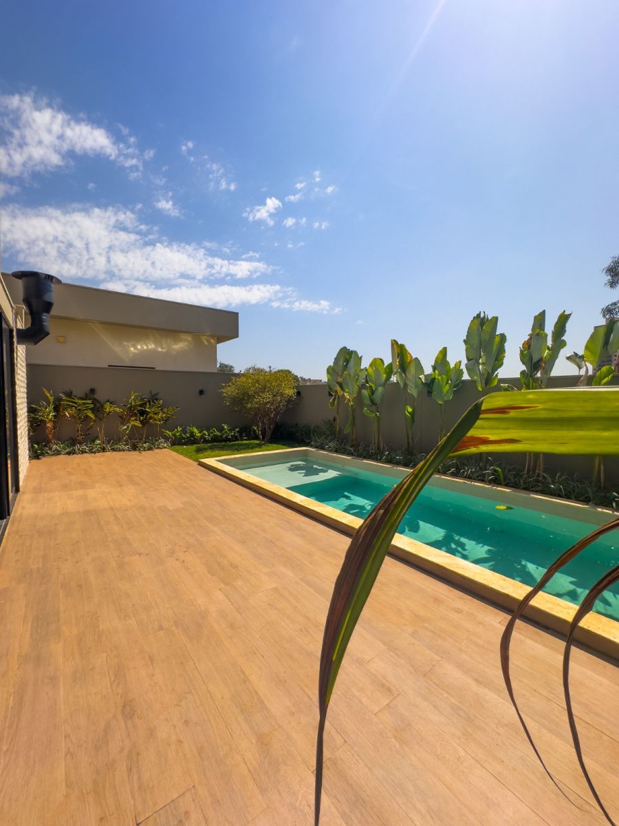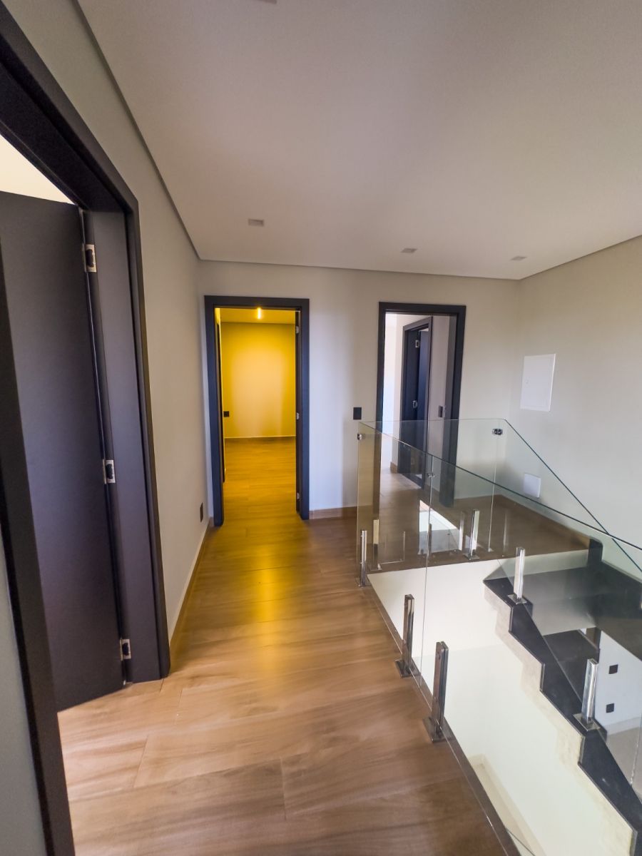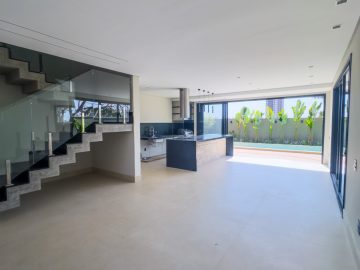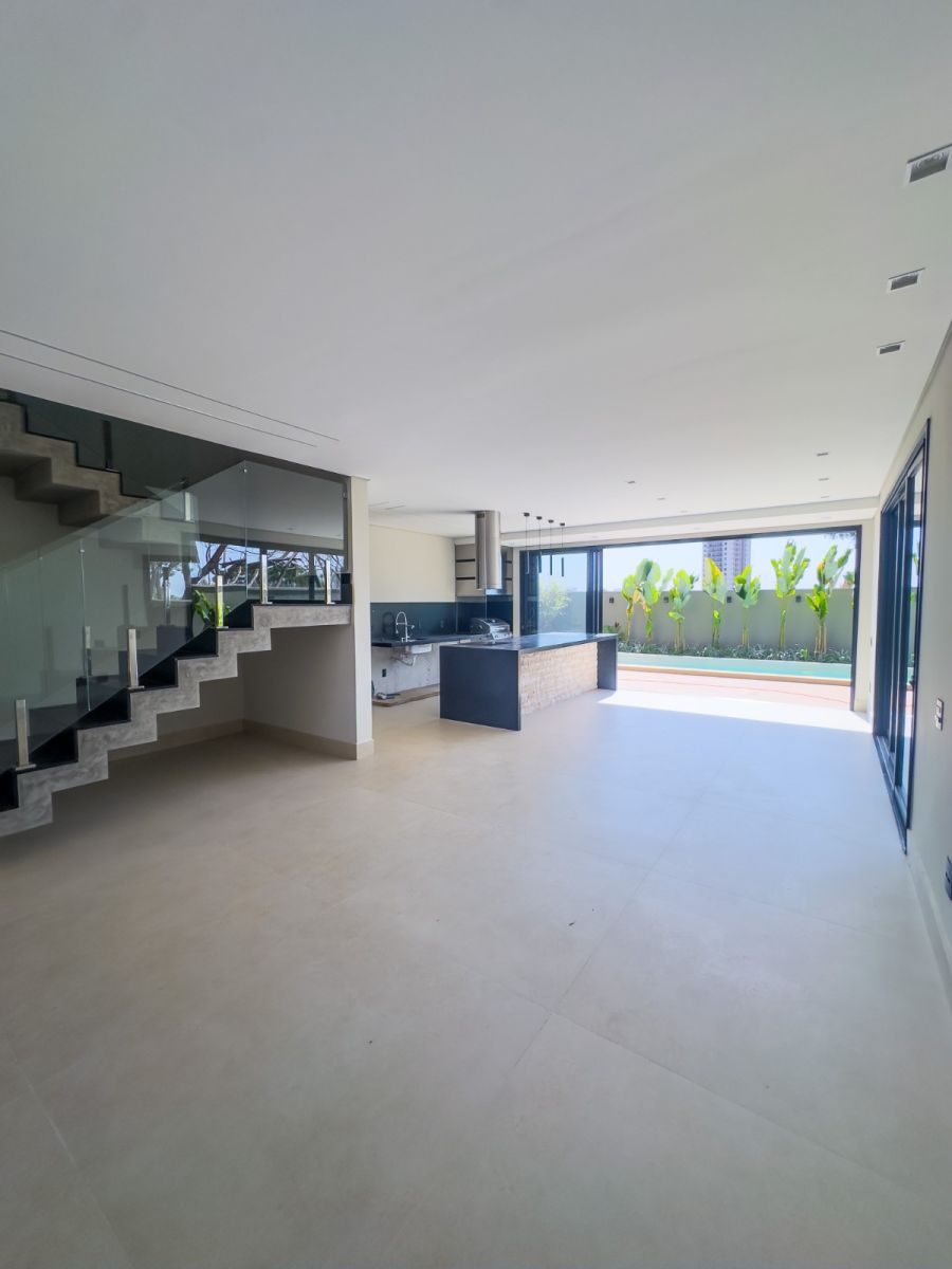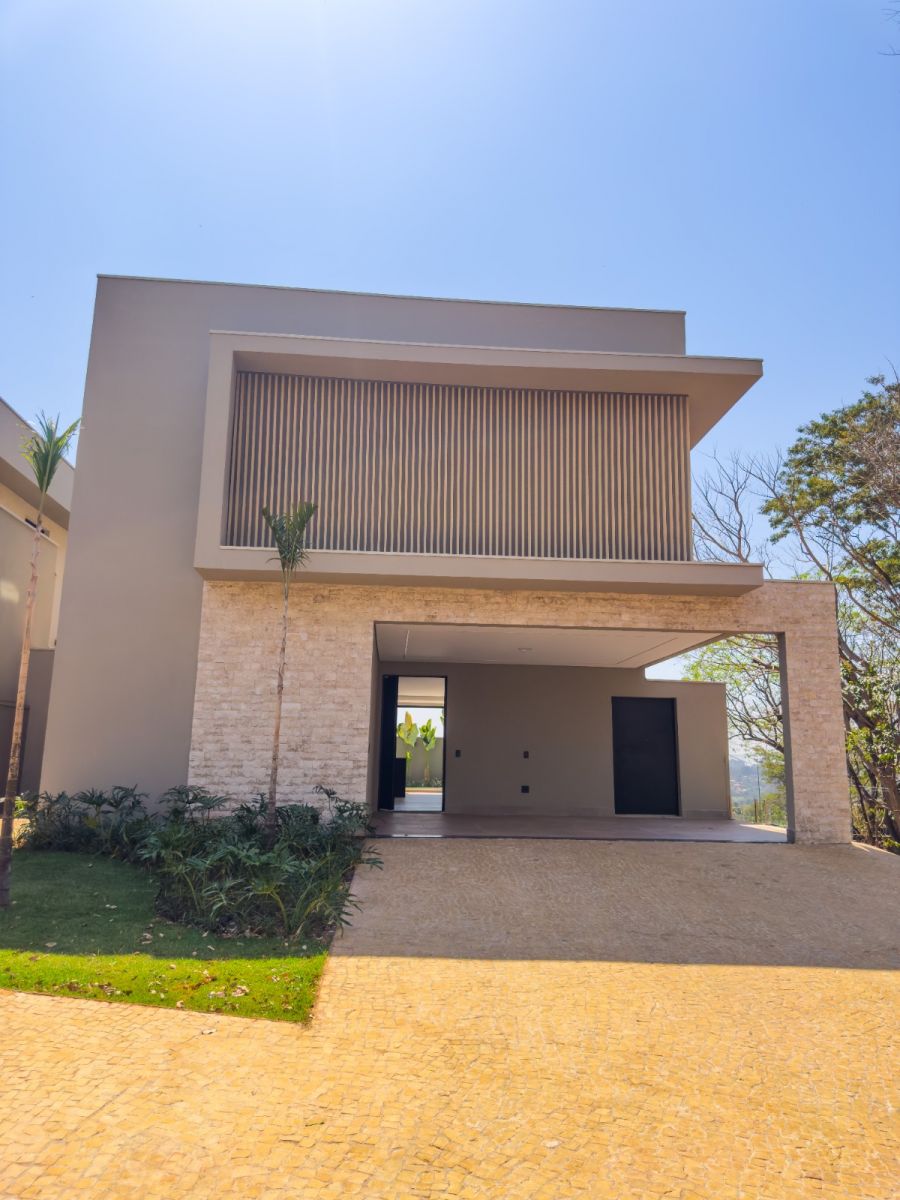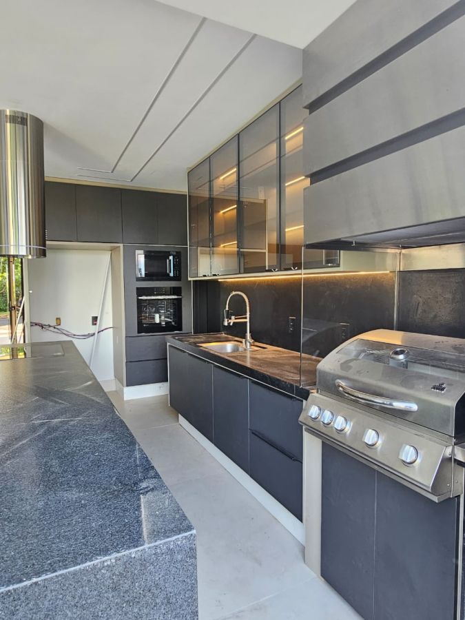 Garagem para 4 carros, sendo 2 vagas cobertas. Sala 2 ambientes, lavabo e escritório, cozinha gourmet com cooktop com coifa, churrasqueira e coifa, área de serviço, 4 suítes, sendo uma no térreo e a master com closet e banheiro com cuba dupla. Varanda gourmet, piscina e vestiário.