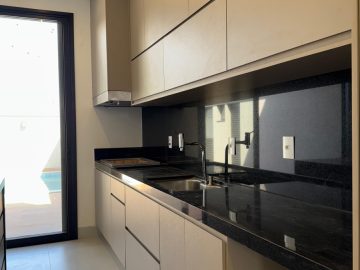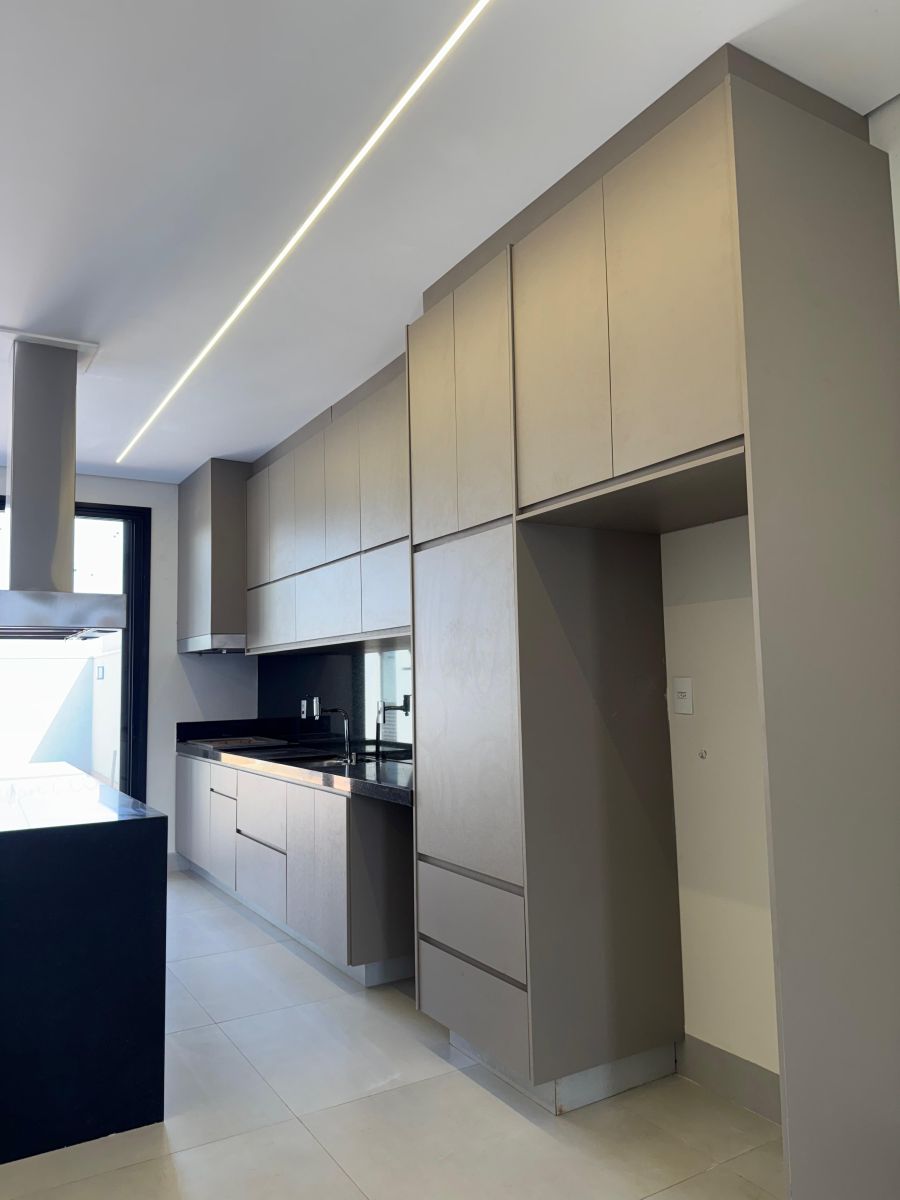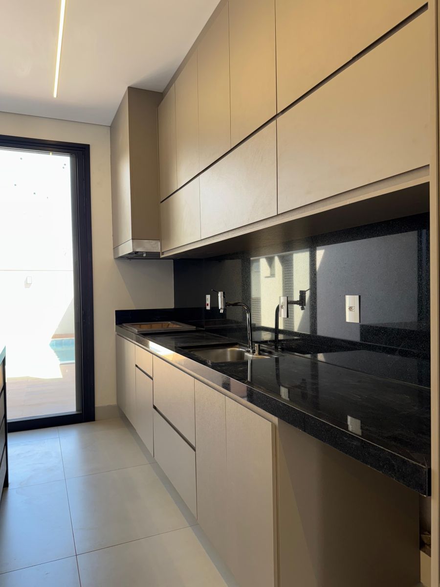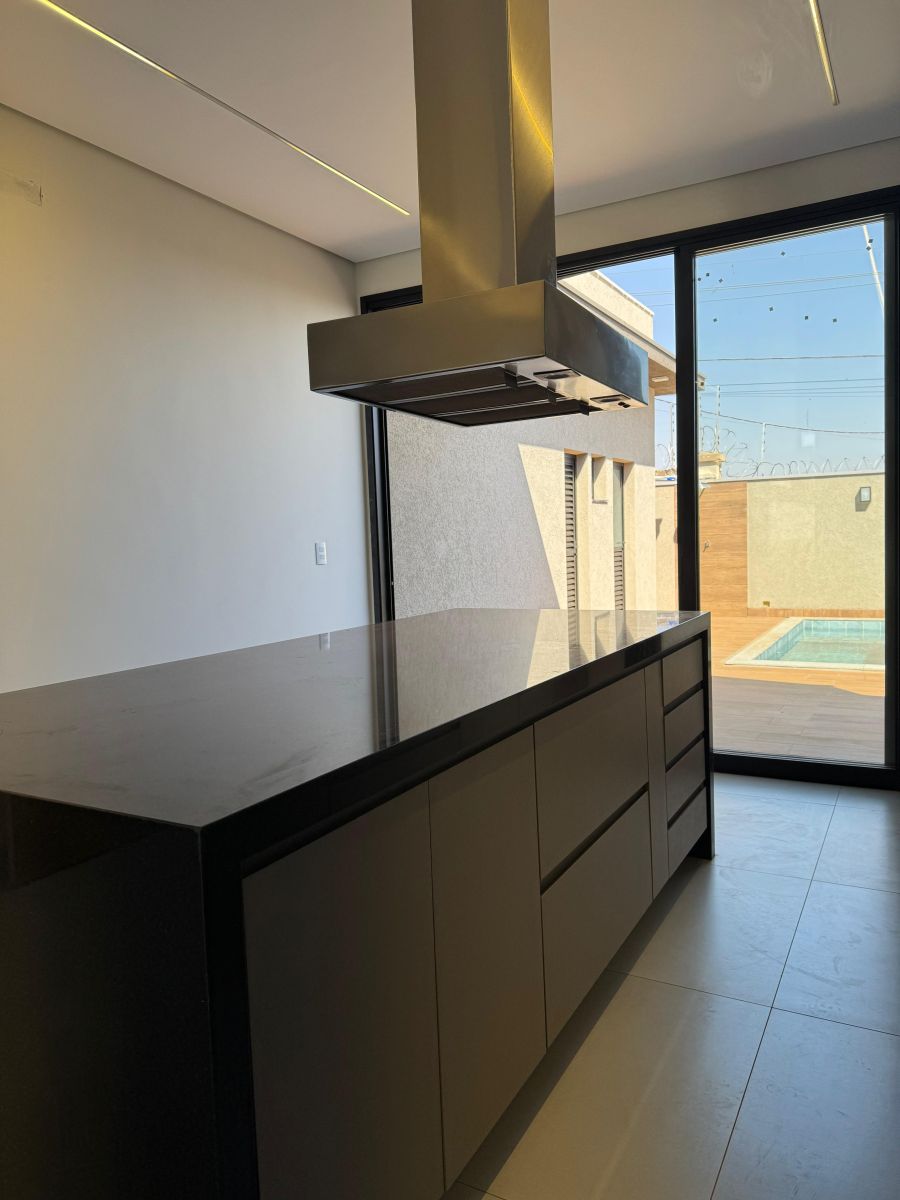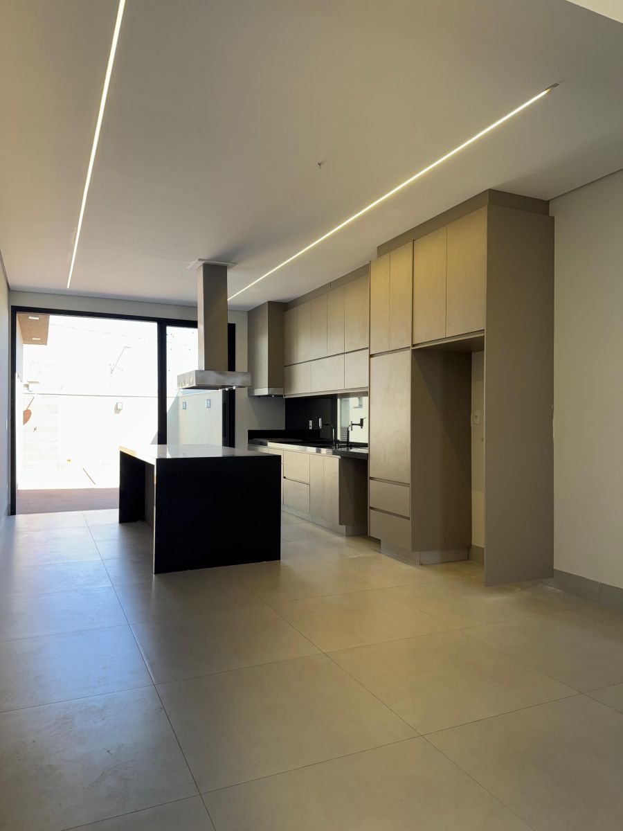 Garagem para 4 carros, sendo 2 cobertas. Sala com pé direito alto integrada a sala de jantar e cozinha gourmet, com ilha e churrasqueira. Escritório. Área de serviço ampla. 3 suítes, sendo a Master com closet e banheiro com cuba e chuveiro duplo. Área externa com solario e piscina com revestimento cerâmico. Vestiário completo. Depósito/despensa.