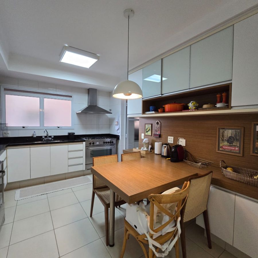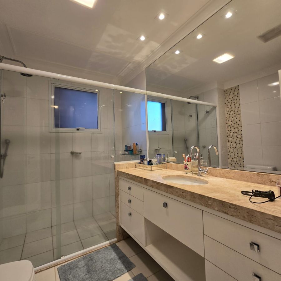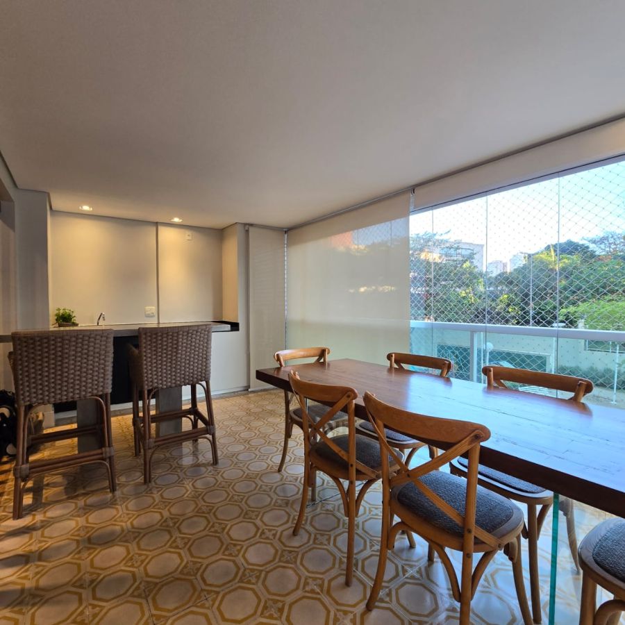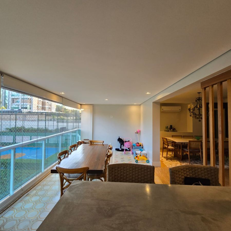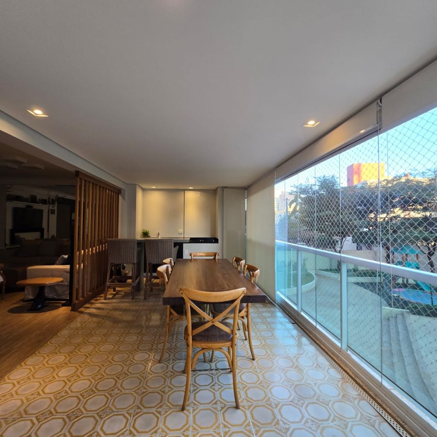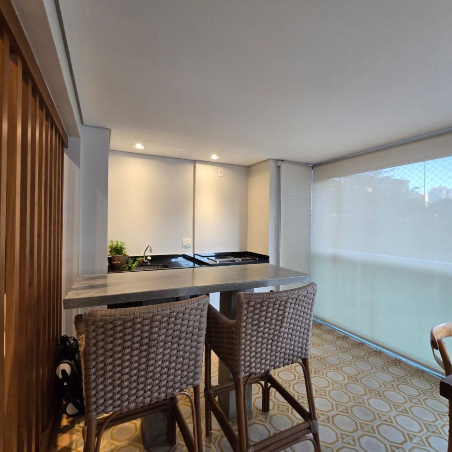 Sala 2 ambientes ampla e ar condicionado, lavabo, escritório, cozinha planejada, área de serviço com banheiro, ainda conta com 3 suítes com armários e ar condcionado, sendo a máster com closet. Uma ampla sacada gourmet com churrasqueira com vista livre e fechamento em vidro e 3 vagas na garagem + box privativo.