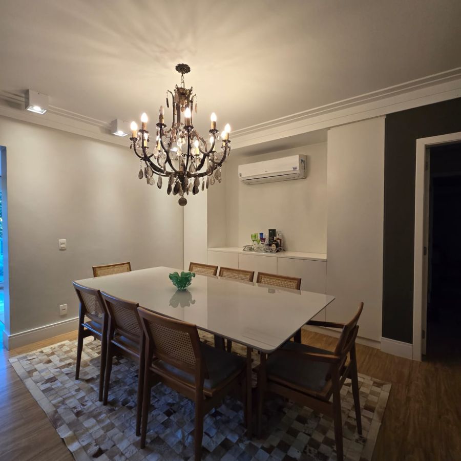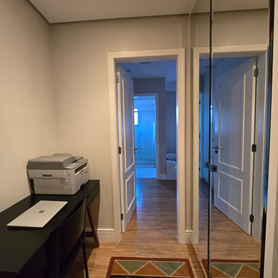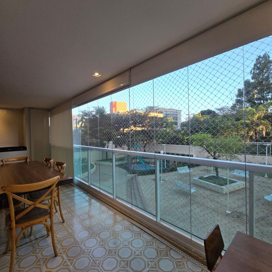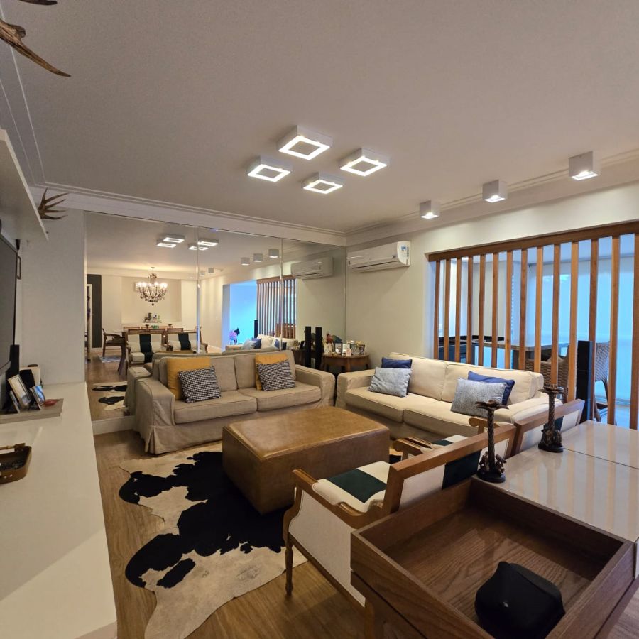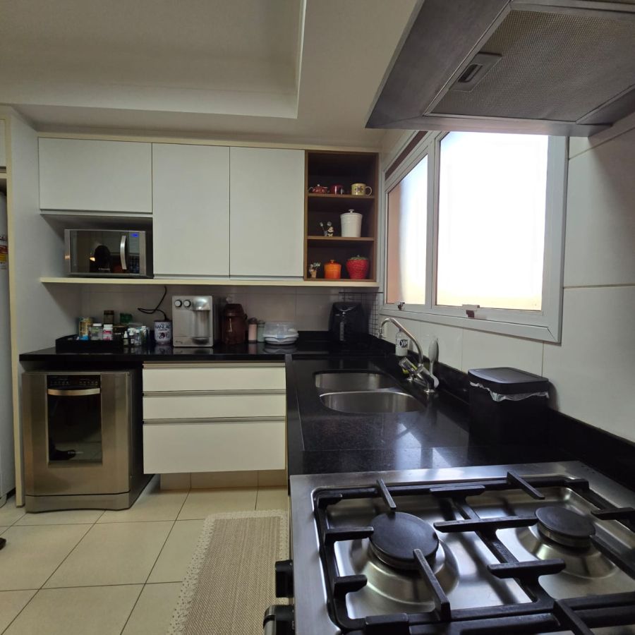 Sala 2 ambientes ampla e ar condicionado, lavabo, escritório, cozinha planejada, área de serviço com banheiro, ainda conta com 3 suítes com armários e ar condcionado, sendo a máster com closet. Uma ampla sacada gourmet com churrasqueira com vista livre e fechamento em vidro e 3 vagas na garagem + box privativo.