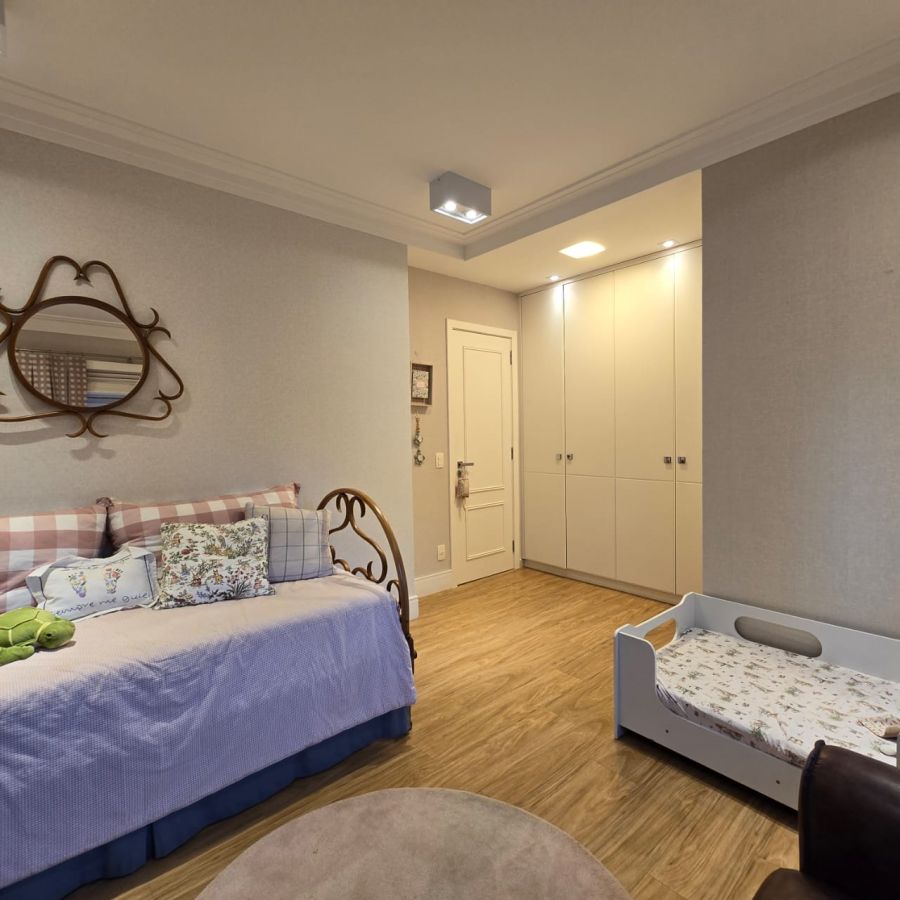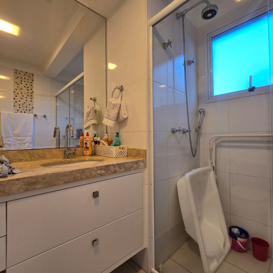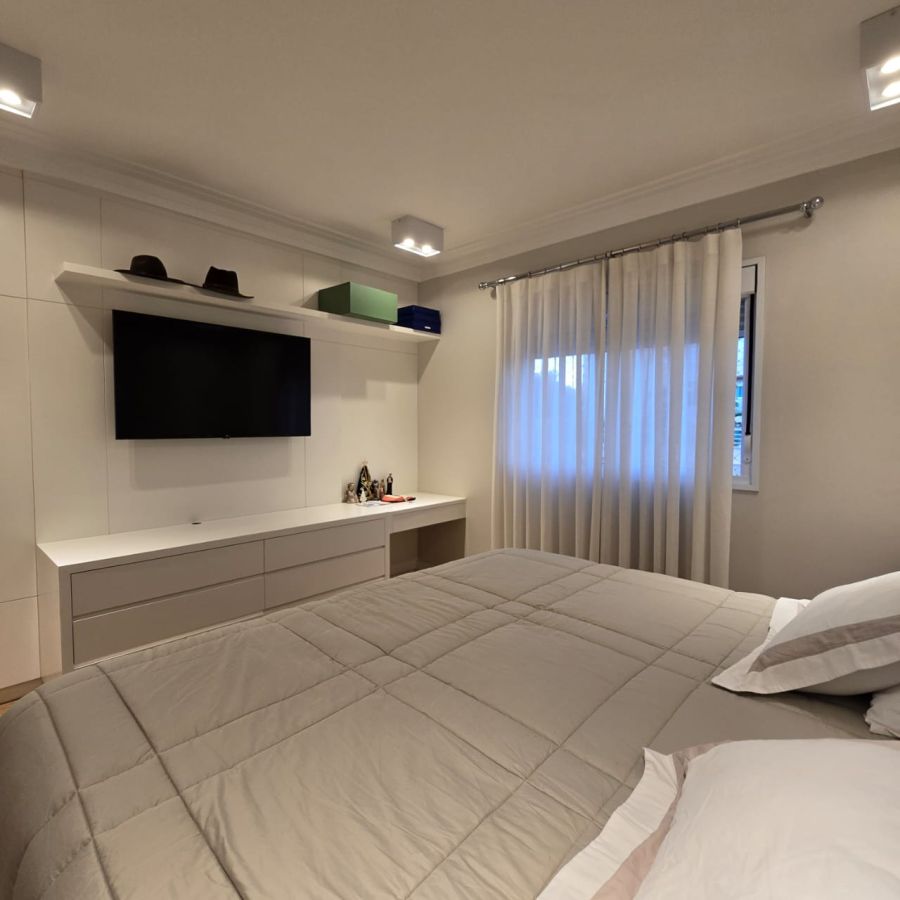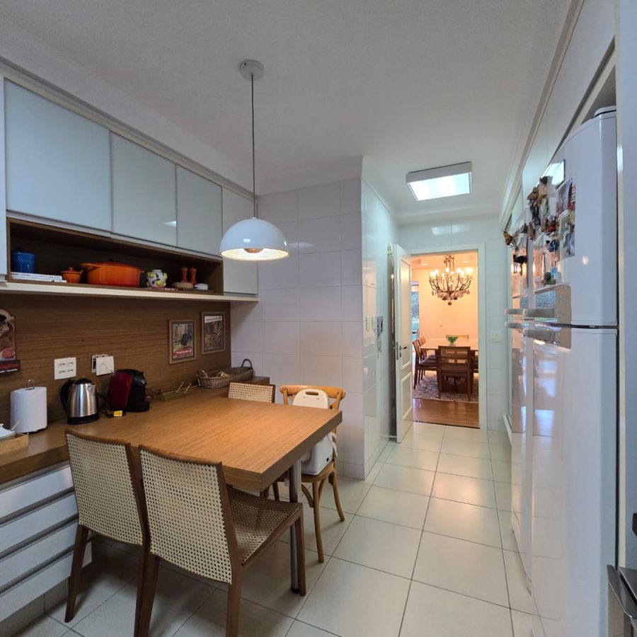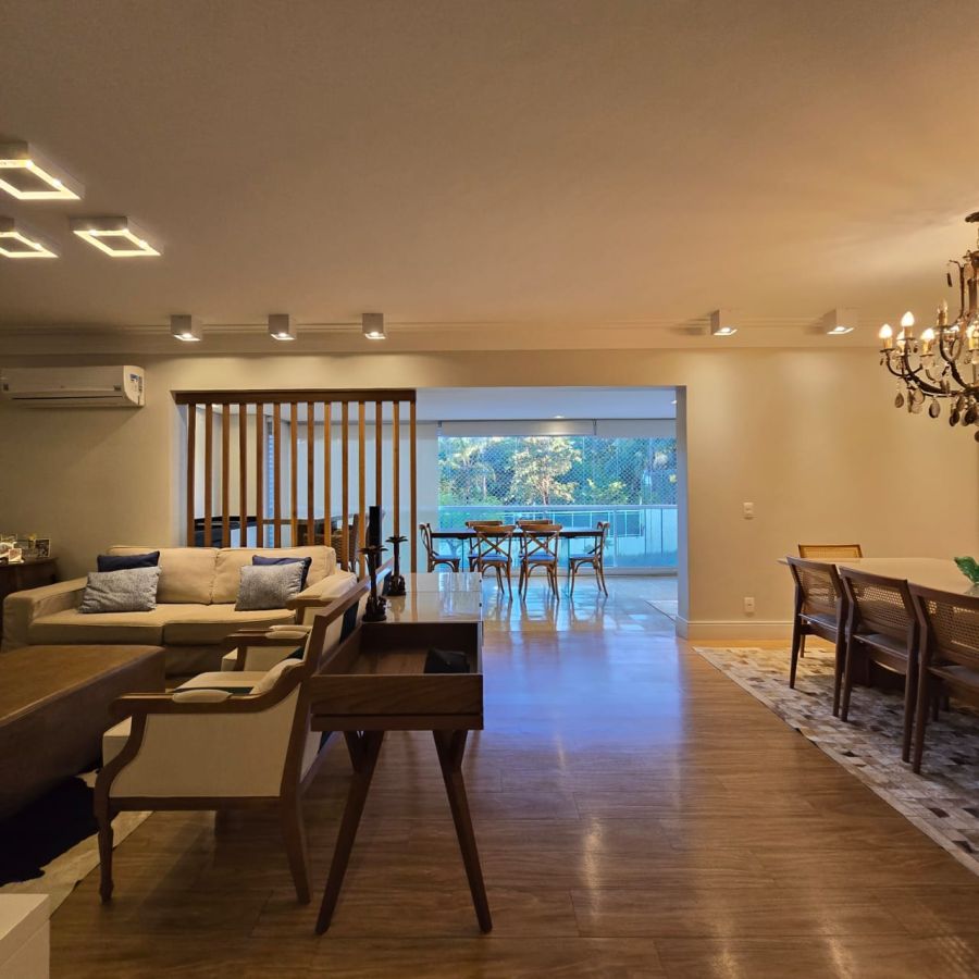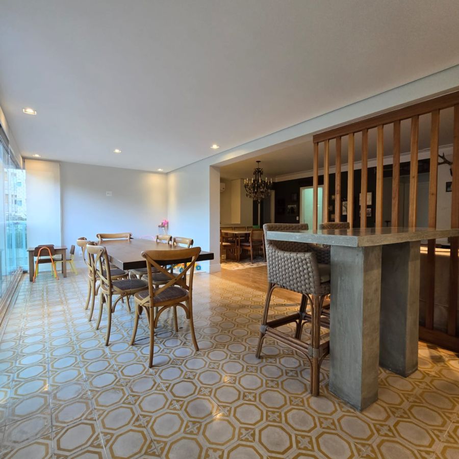 Sala 2 ambientes ampla e ar condicionado, lavabo, escritório, cozinha planejada, área de serviço com banheiro, ainda conta com 3 suítes com armários e ar condcionado, sendo a máster com closet. Uma ampla sacada gourmet com churrasqueira com vista livre e fechamento em vidro e 3 vagas na garagem + box privativo.