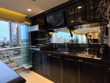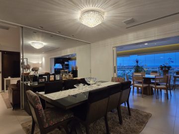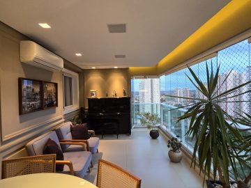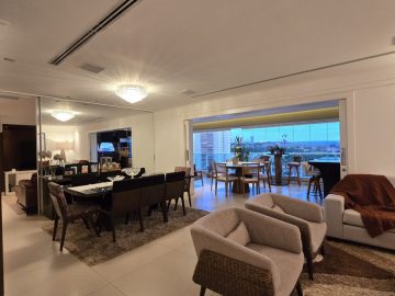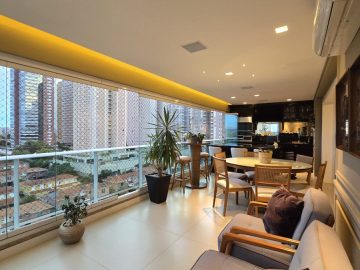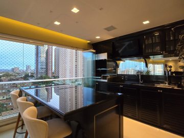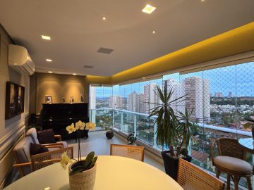 Este imóvel no Edifício Amsterdam alia sofisticação e conforto em ambiente singular. Apresenta três suítes com ar condicionado e armários planejados, sendo a suíte máster equipada com closet. A área social é ampla e integrada, com salas de estar, jantar e TV, conectadas à varanda gourmet com balcão refrigerado, churrasqueira, cooktop e chopeira. O piso nivelado e a integração dos ambientes conferem modernidade e praticidade.
