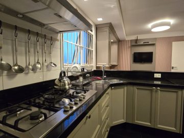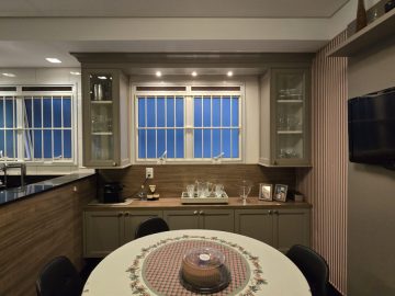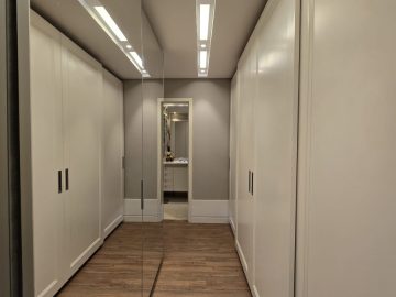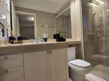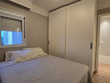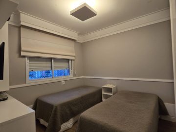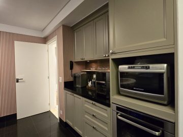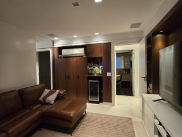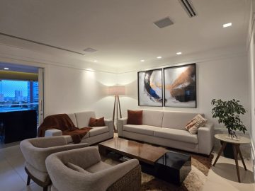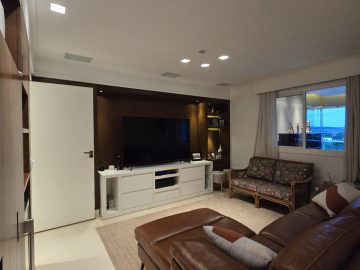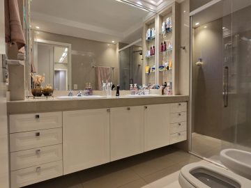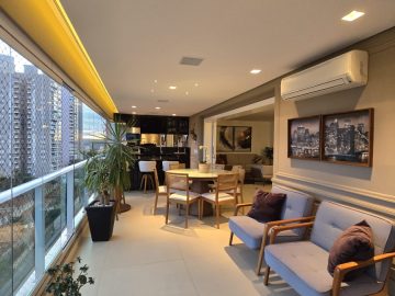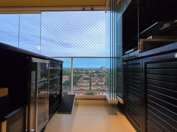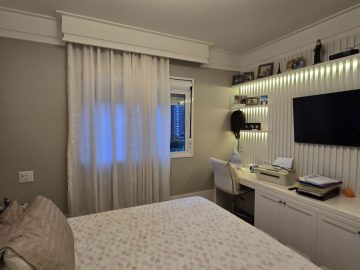 O apartamento inclui ainda escritório, lavabo, cozinha planejada e área de serviço espaçosa com banheiro. O sistema de ar condicionado central VRF que garante climatização ideal em toda a área social, automação Automundi, e armários Florense.