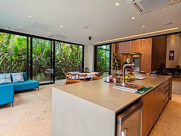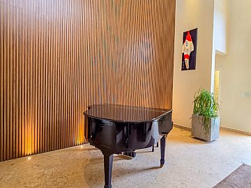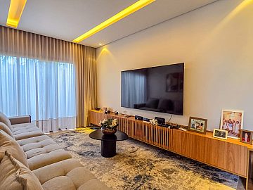 Living com pé-direito duplo, trazendo imponência e excelente iluminação natural
