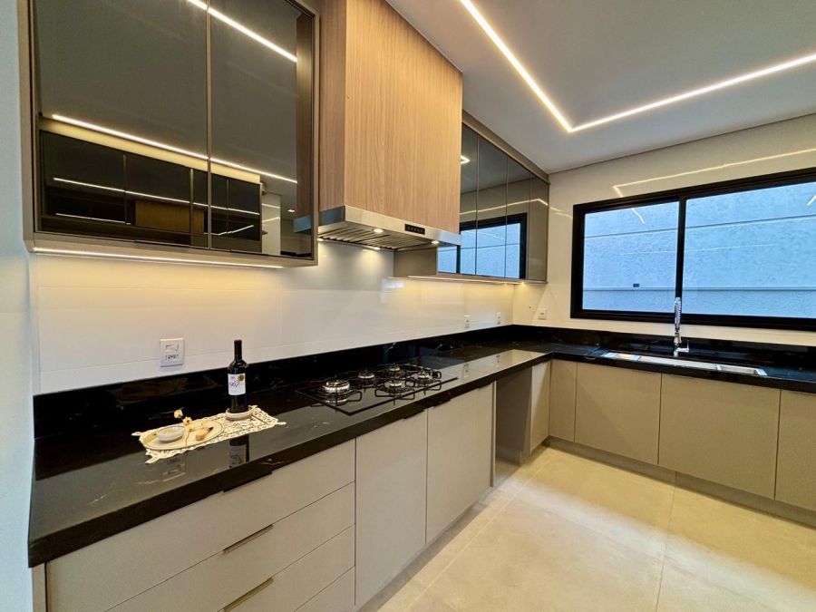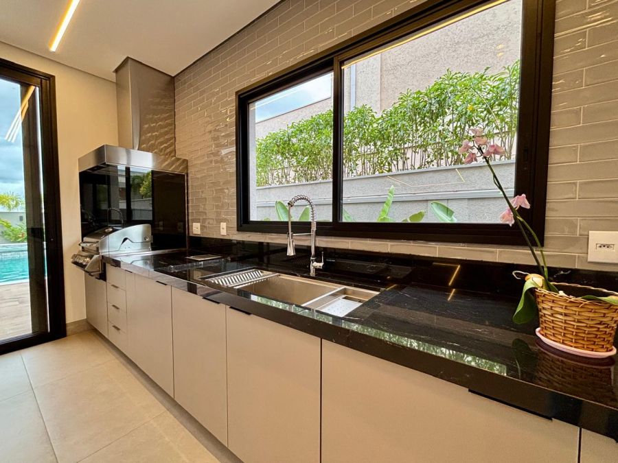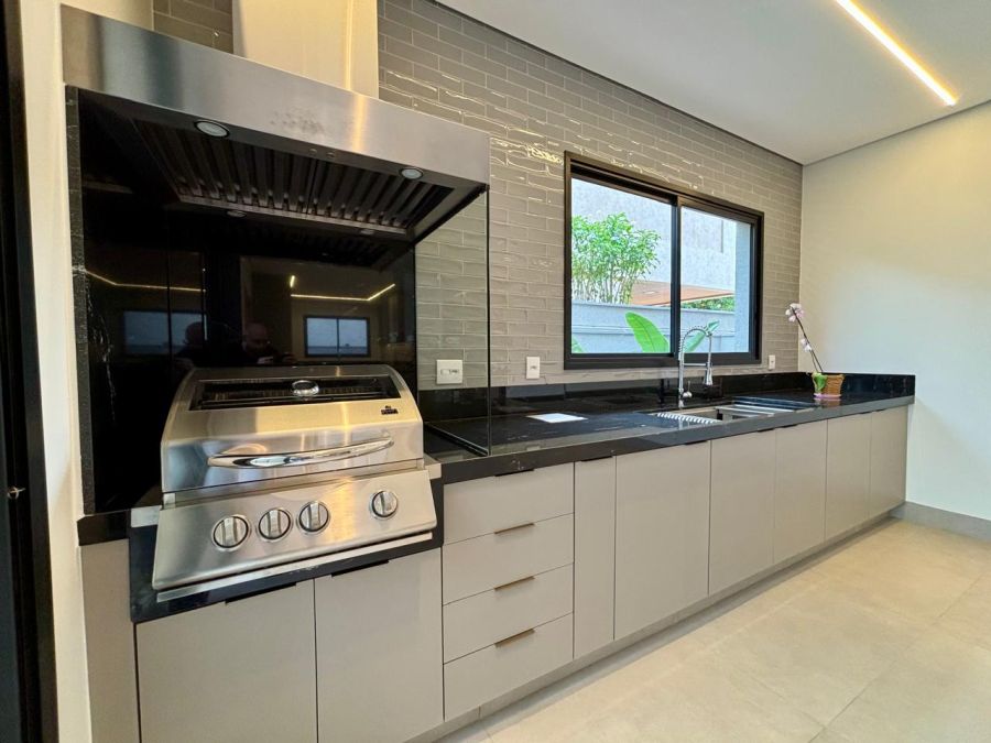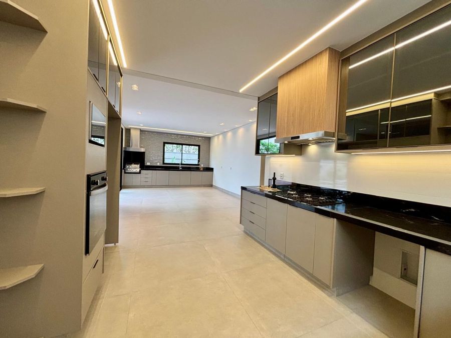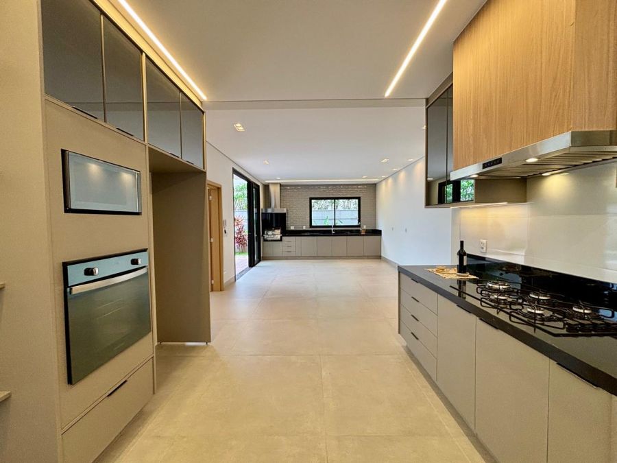 - cozinha equipada com cooktop, coifa, forno e micro-ondas, interligada com a área gourmet equipada com churrasqueira a gás e coifa com motor de potência maior. Cozinha e área gourmet com instalação de calha úmida e lixeira, para cada ambiente;