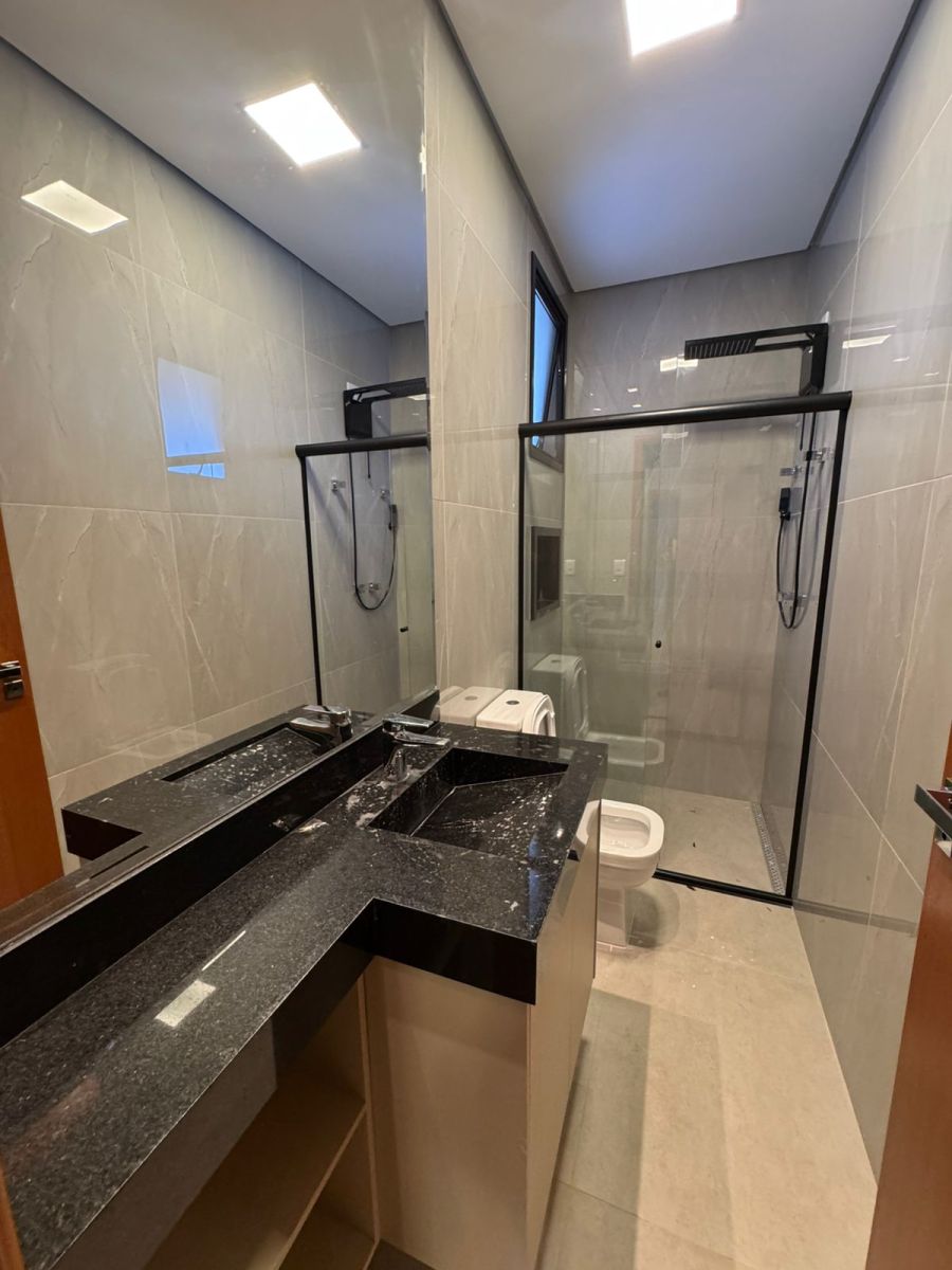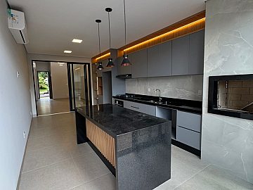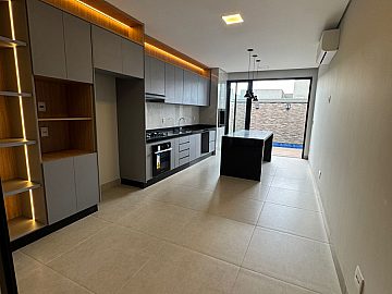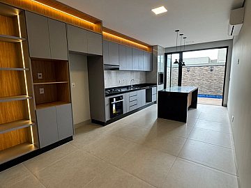 3 suítes, sala 2 ambientes com pé direito alto, escritório, lavabo, cozinha e gourmet integradas com churrasqueira, cooktop, forno e coifa, piscina aquecida com hidro, cascata e iluminação, banheiro externo e lavanderia. Completa em armários, iluminação e ar-condicionado. Aquecimento solar. 4 vagas, sendo 2 cobertas.