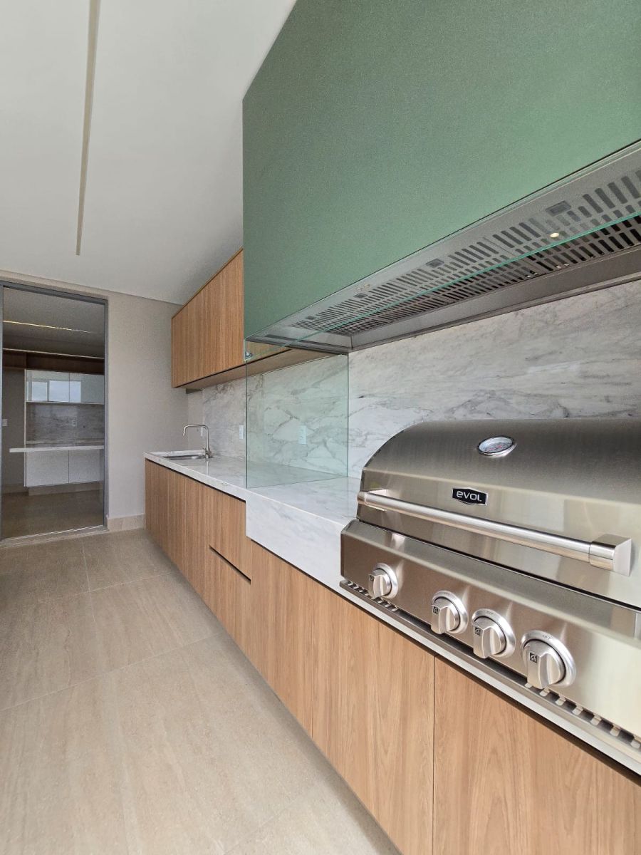 Varanda gourmet com churrasqueira e coifa