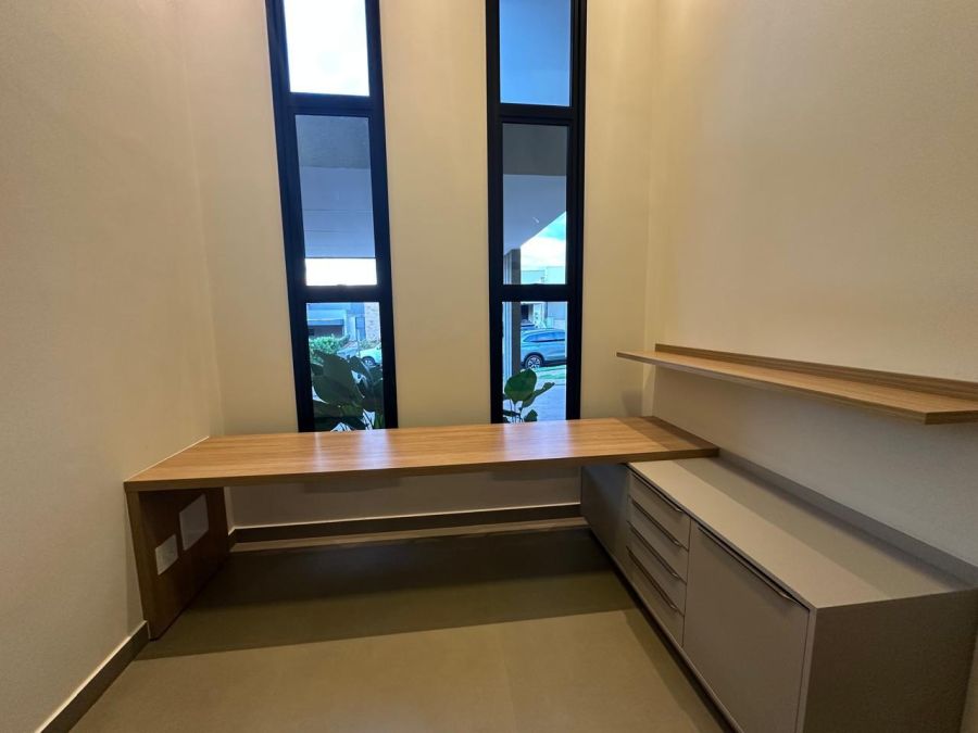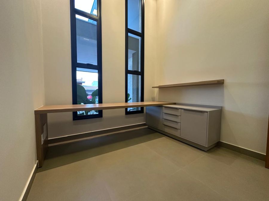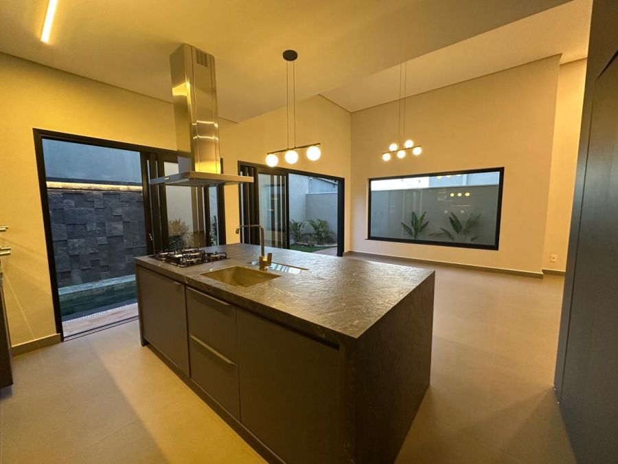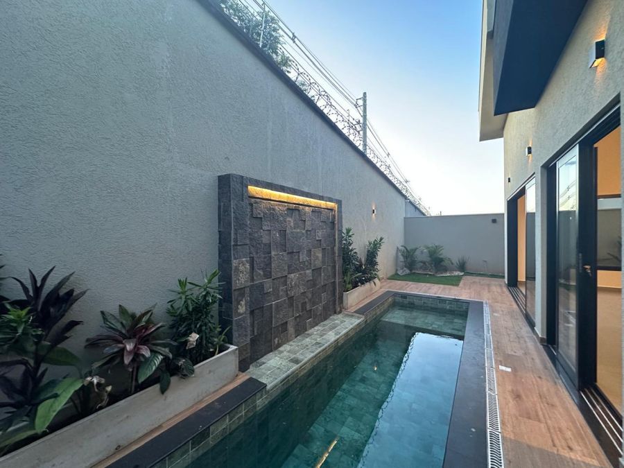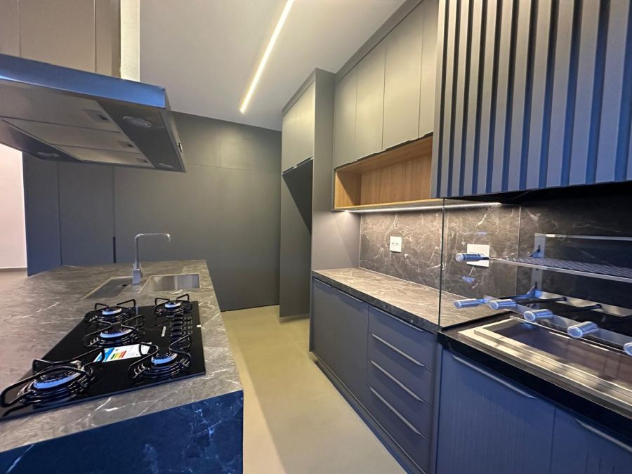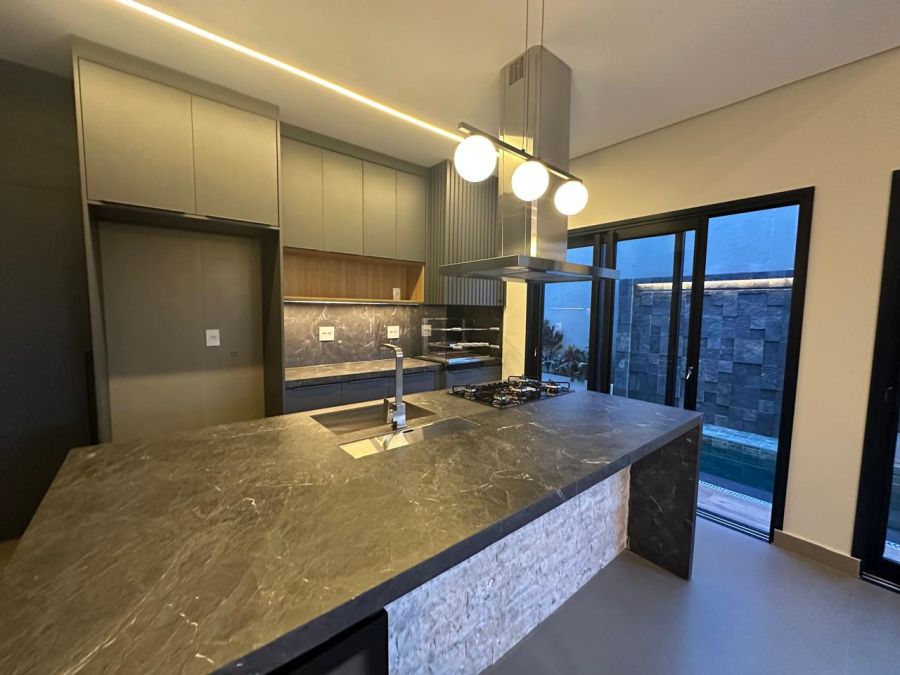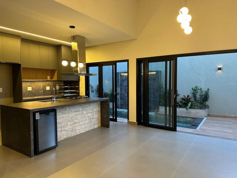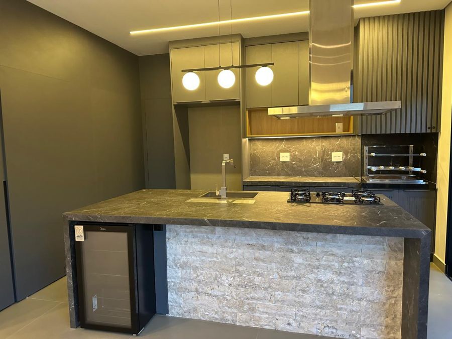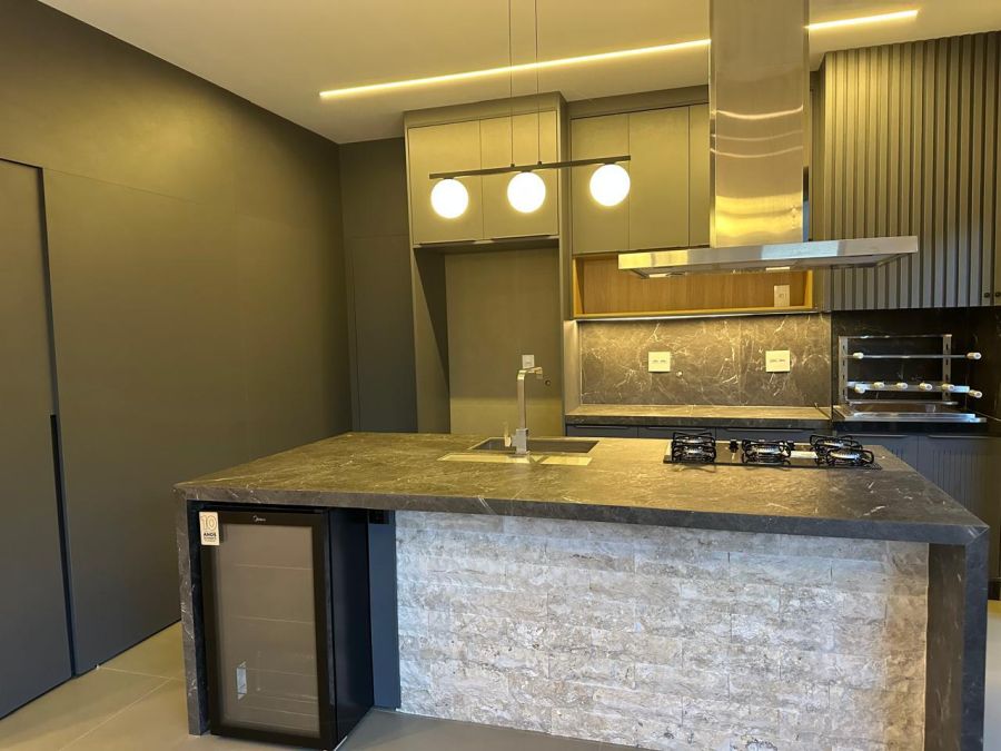 3 suítes com closet e portas balcão automáticas - máster com cubas e chuveiros duplos, ampla sala 2 ambientes com pé direito alto, escritório (reversível para 4ª suíte), lavabo, cozinha gourmet com ilha, cooktop, exaustor, churrasqueira e geladeira tripla função (adega, frigobar ou cervejeira). Piscina em azulejos, com cascata e iluminação, banheiro externo e lavanderia. Completa em armários planejados, iluminação, climatização e paisagismo. 4 vagas, sendo 2 cobertas.