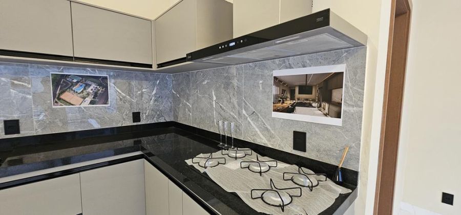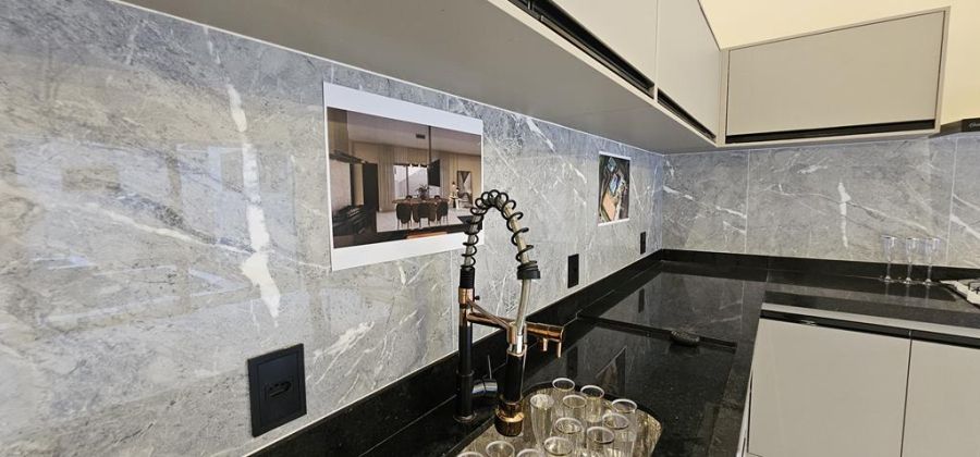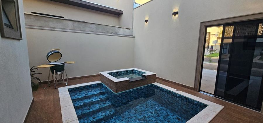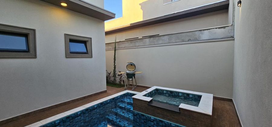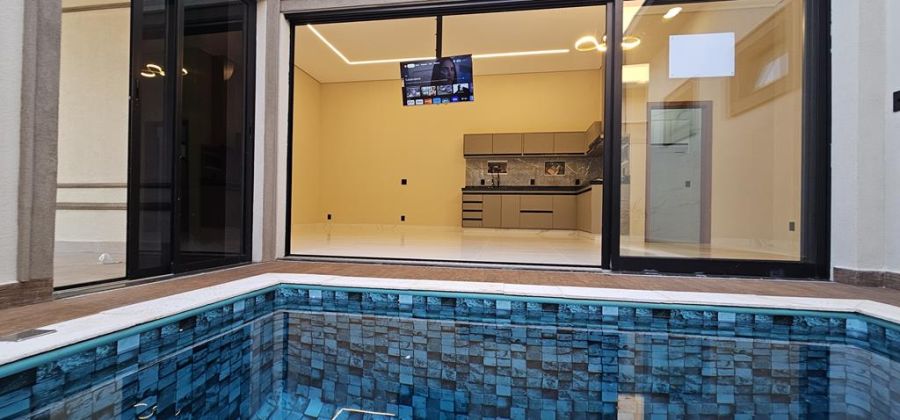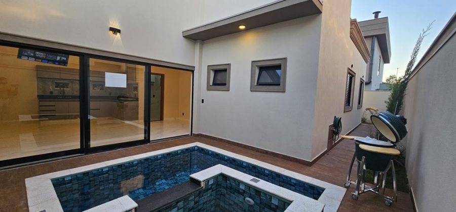 Arquitetura Neoclássica com 3 suítes, sendo a máster com closet, cubas e chuveiros duplos, escritório, lavabo, amplas salas de estar e jantar integradas com a cozinha - já equipada com cooktop, coifa, televisão e churrasqueira importada, piscina com hidro e cascata e paisagismo com ciprestes italianos. Completa em armários, iluminação, ares-condicionados, box e espelhos. Preparação para fotovoltaica. 4 vagas, sendo 2 cobertas.